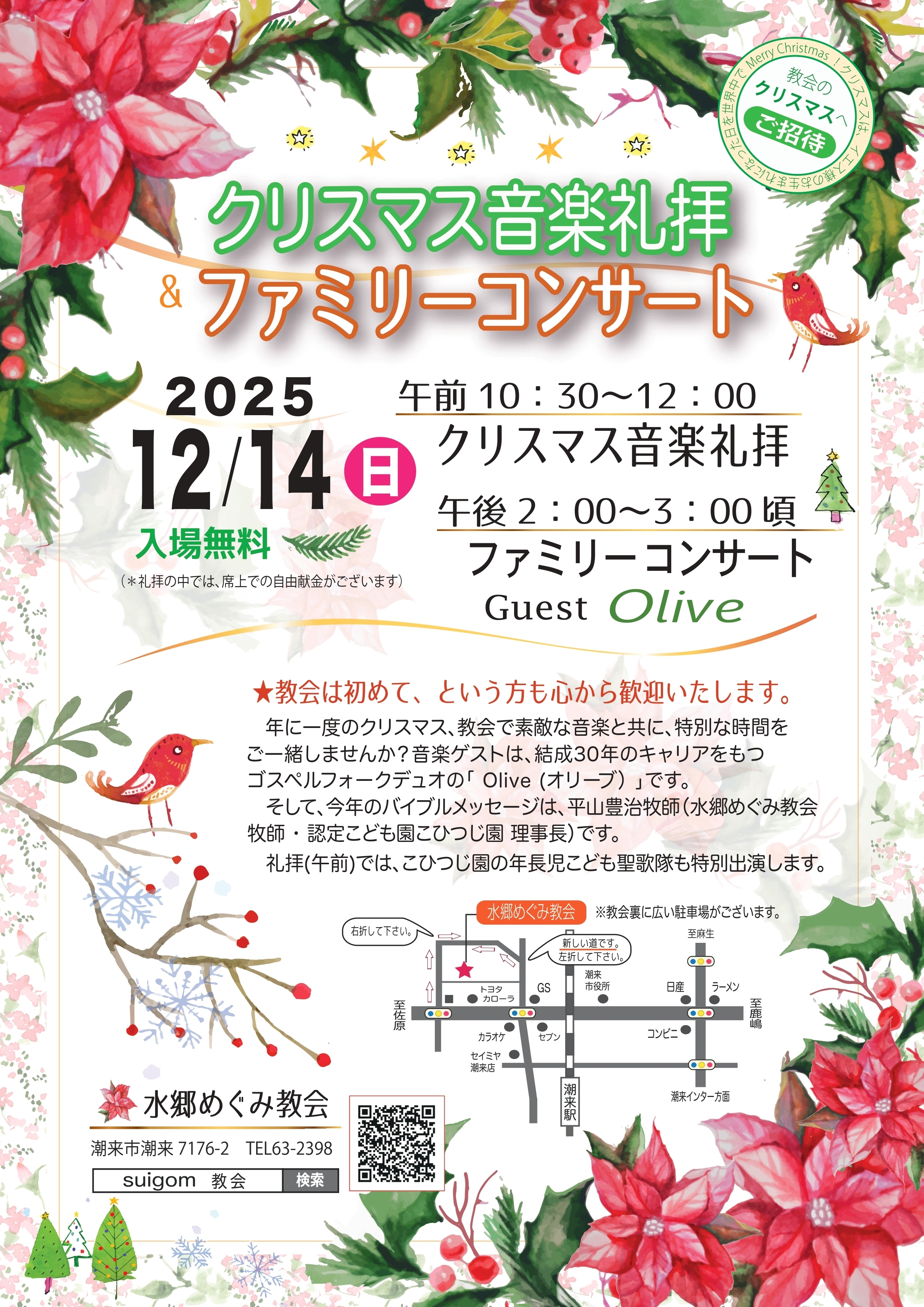 音楽ゲストに、ゴスペルフォークデュオの「Olive」をお迎えします。こひつじ園年長児の子ども聖歌隊もゲスト出演します。年に一度のクリスマス、教会で素敵な音楽と共に、ひと時ご一緒しませんか?