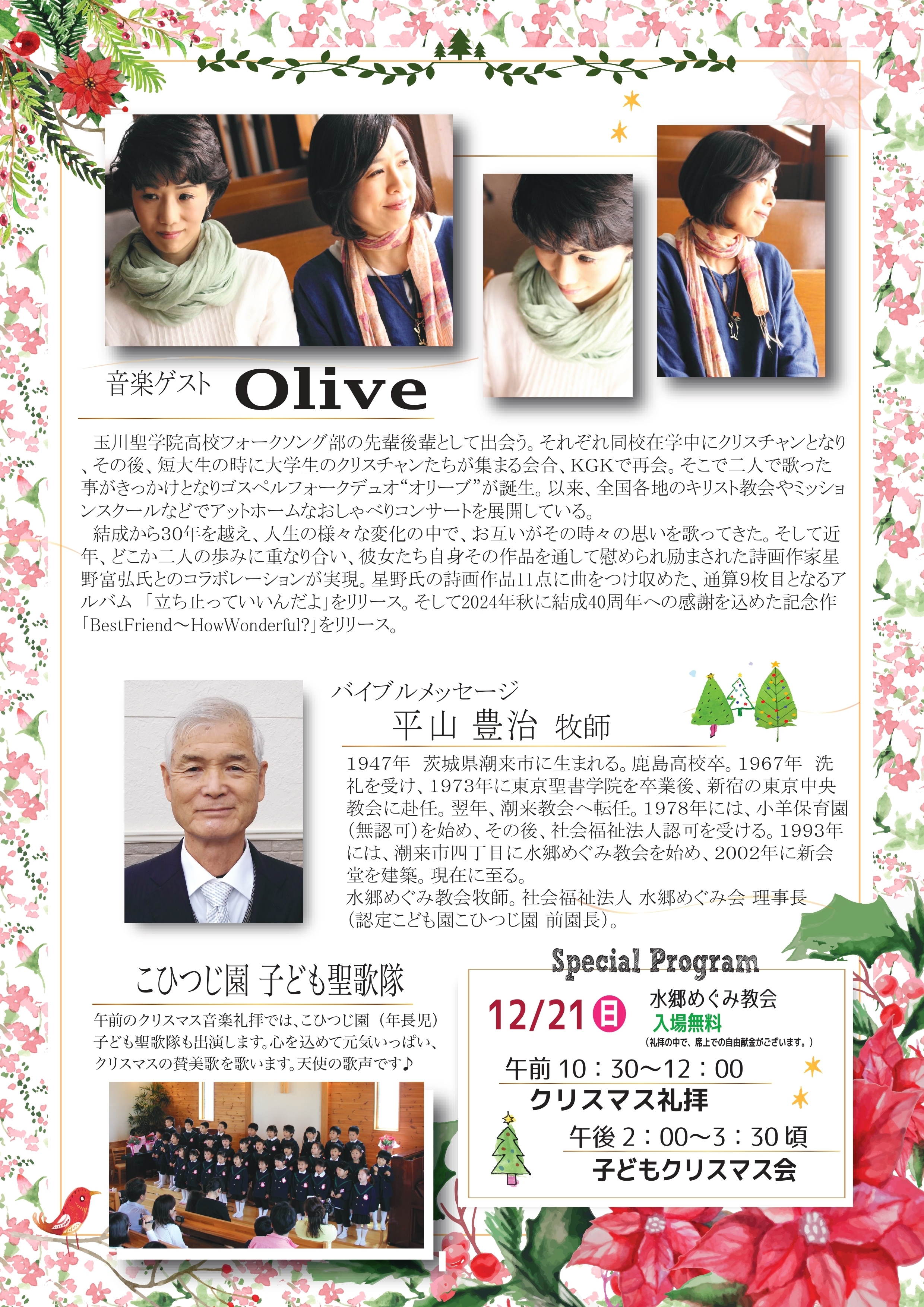 音楽ゲストに、ゴスペルフォークデュオの「Olive」をお迎えします。こひつじ園年長児の子ども聖歌隊もゲスト出演します。年に一度のクリスマス、教会で素敵な音楽と共に、ひと時ご一緒しませんか?