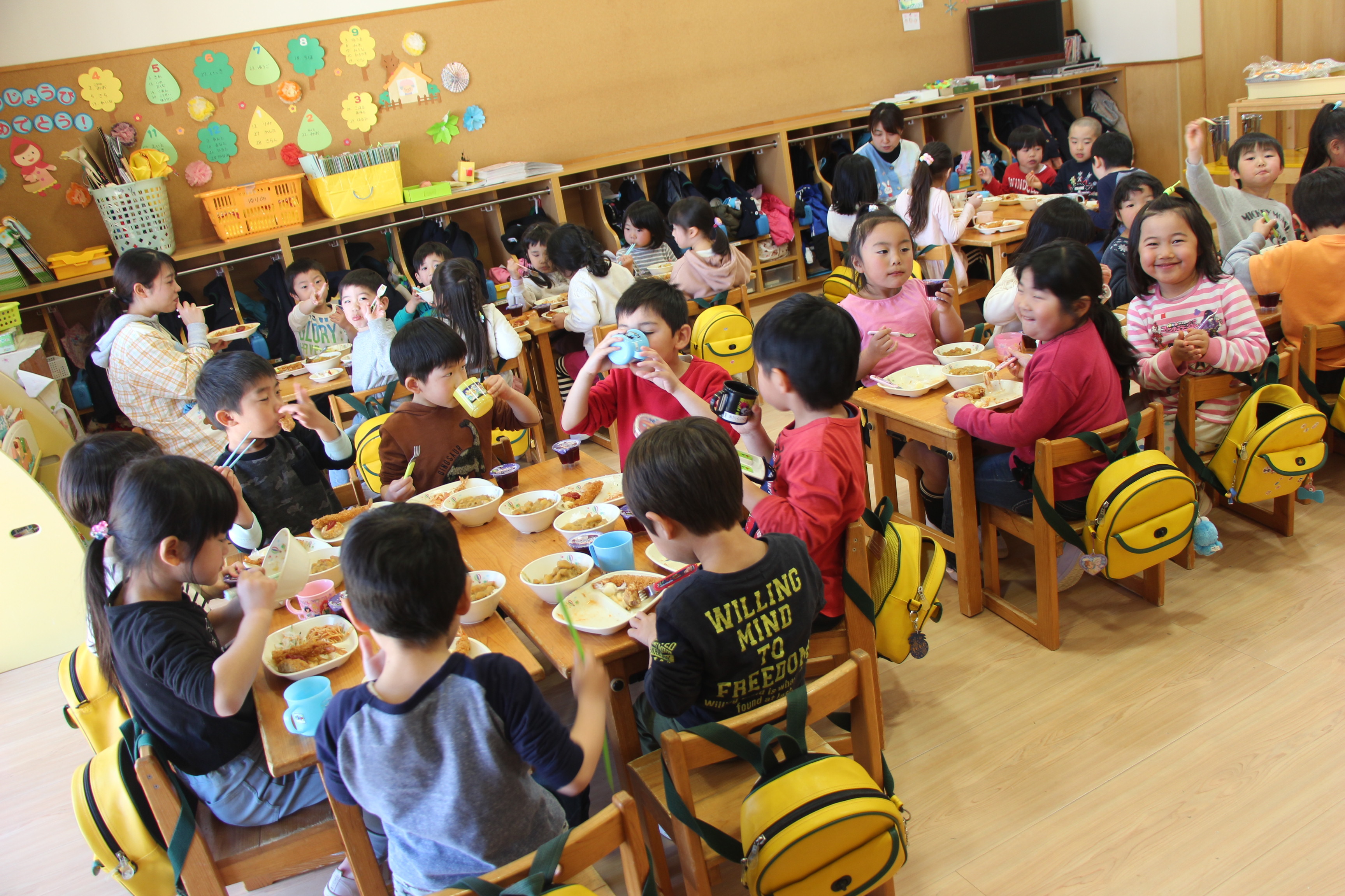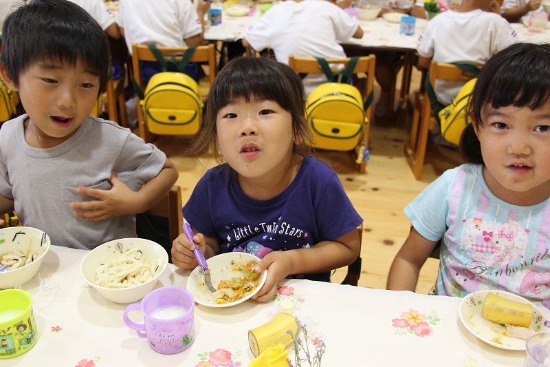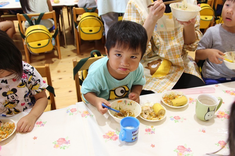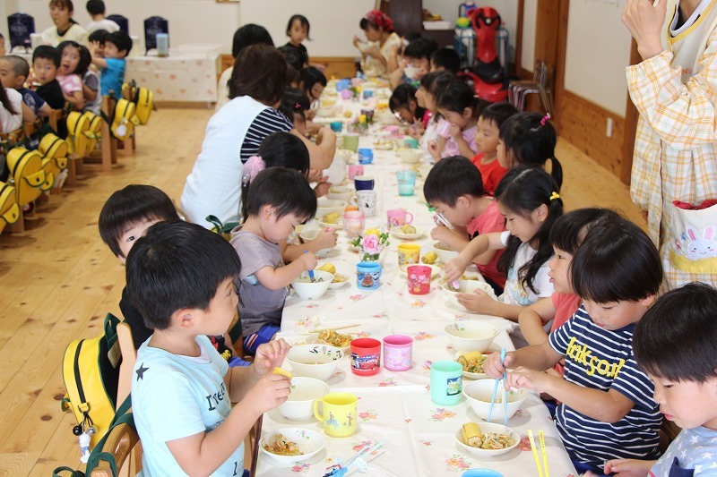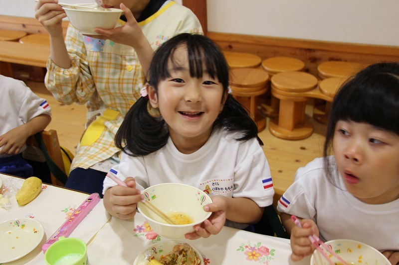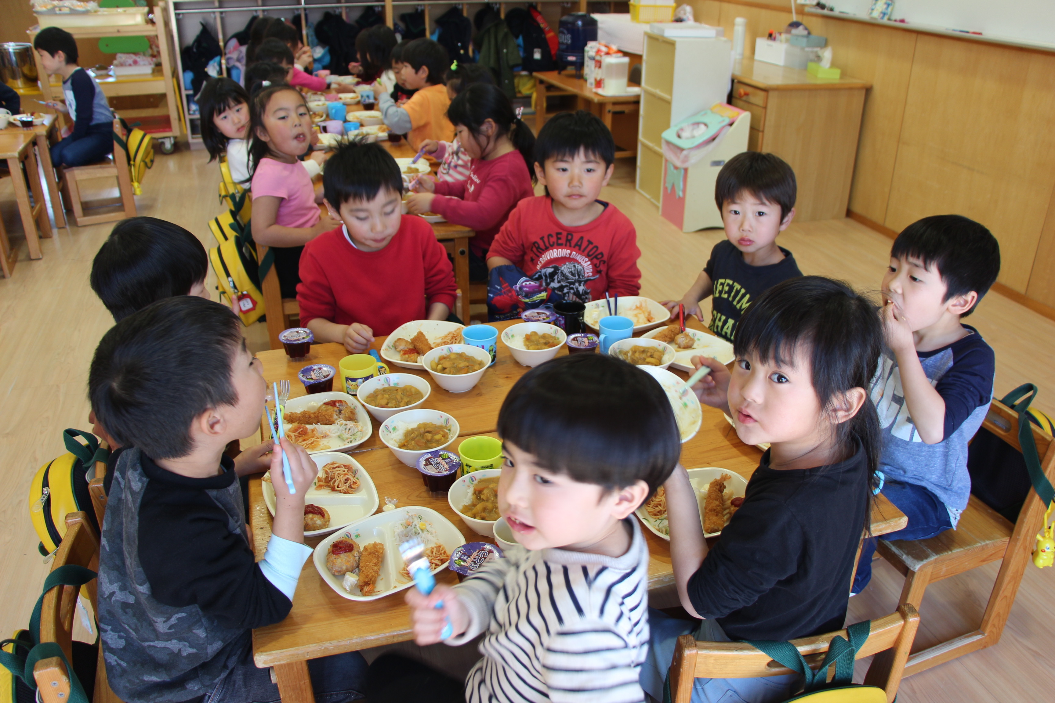 さくら組、ゆり組、ばら組は、お遊戯室でこひつじレストランで給食を頂きました。いつもと違った雰囲気で、みんなで美味しくランチタイム♪ レストランの前には、栄養士からの食育のお話がありました。