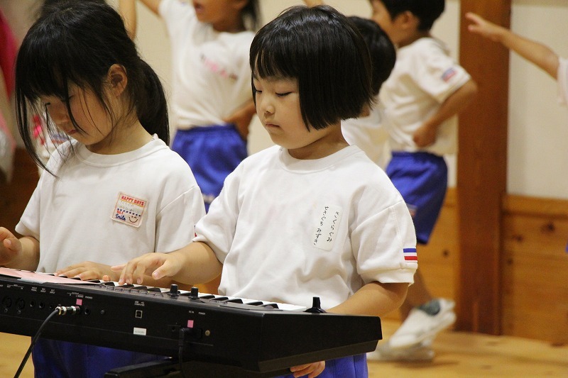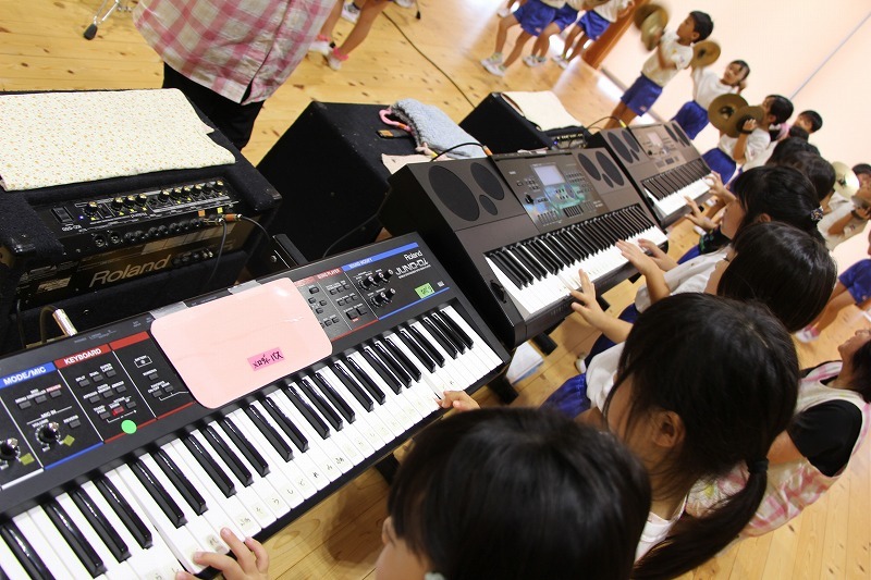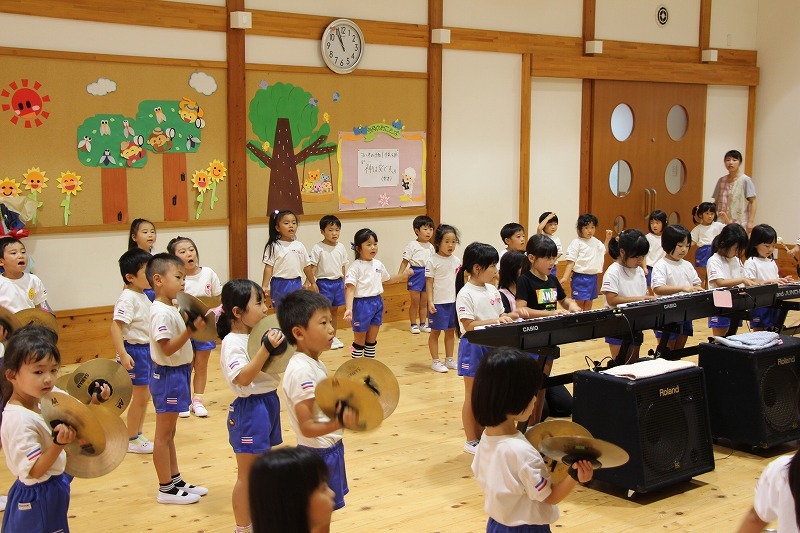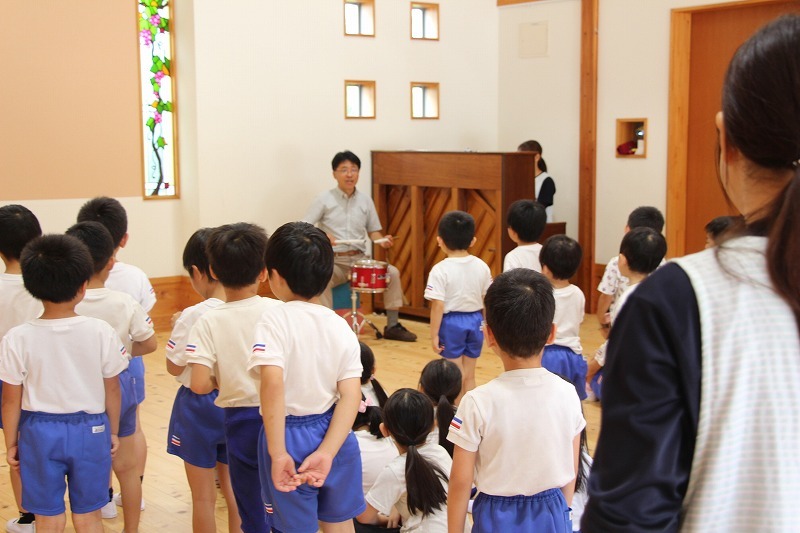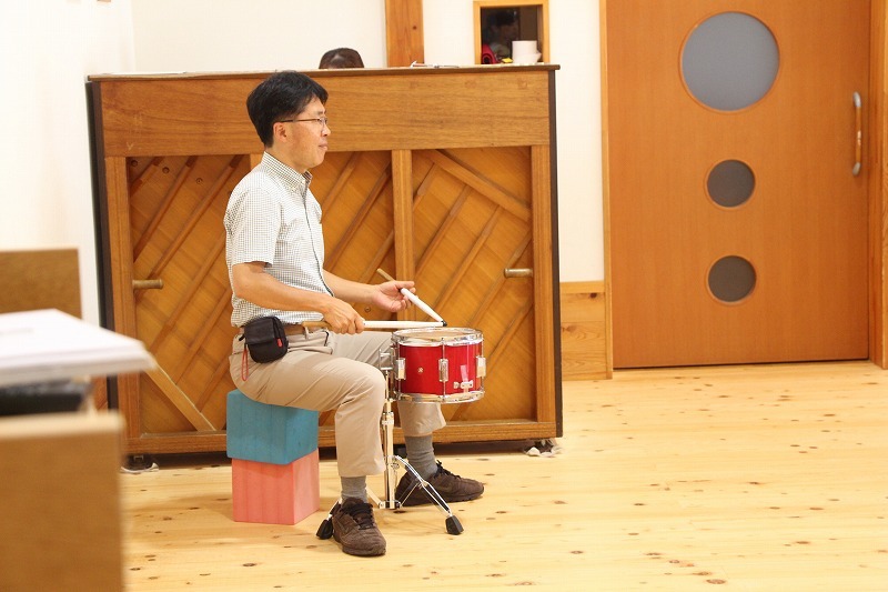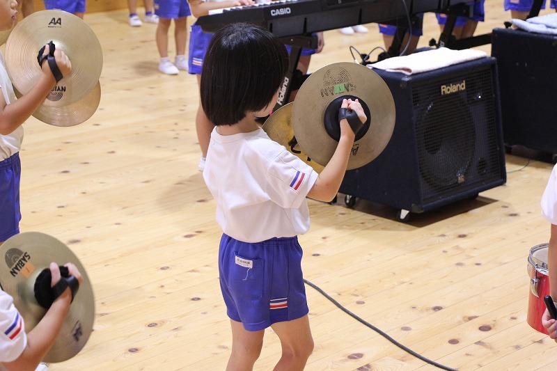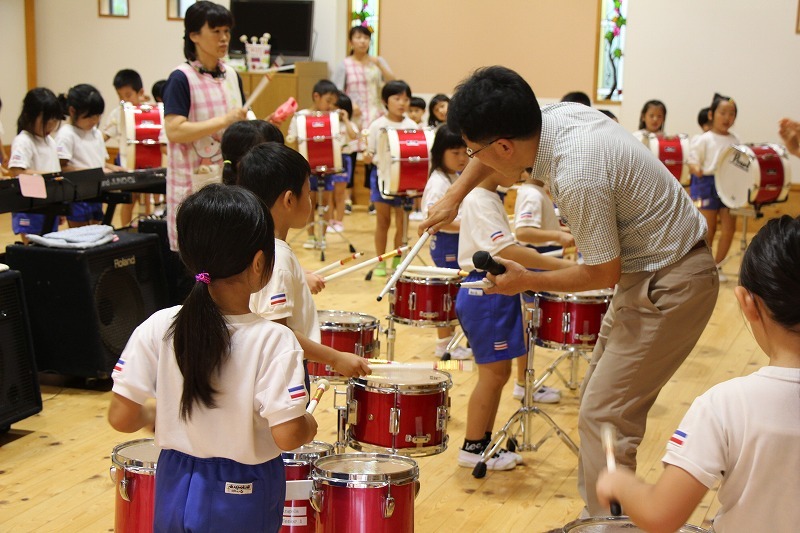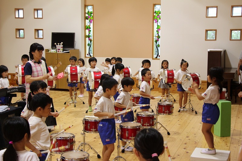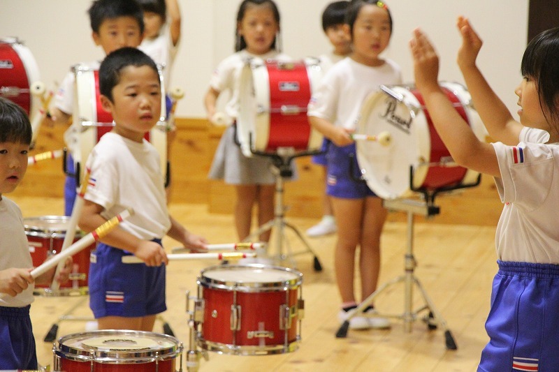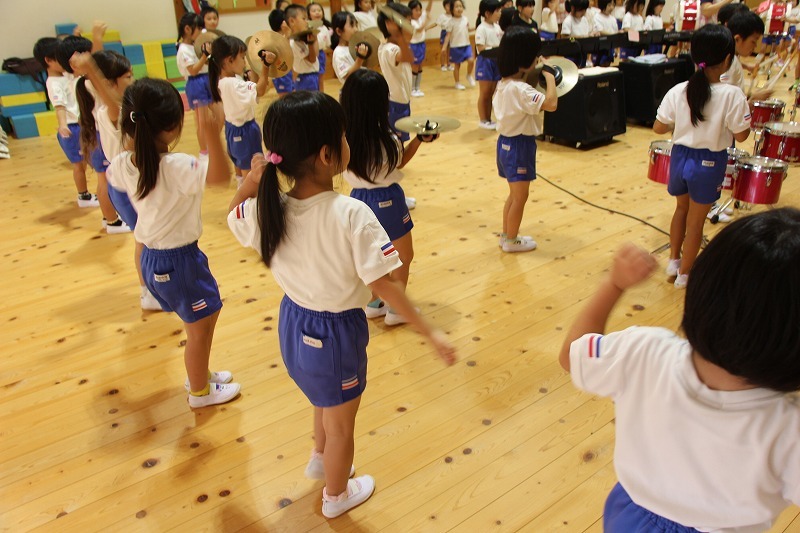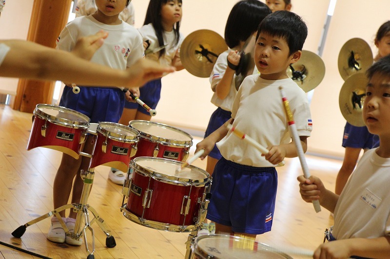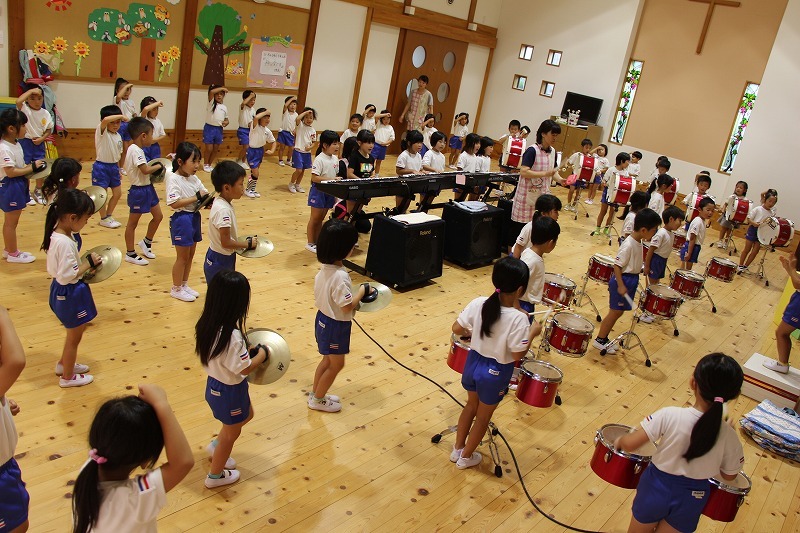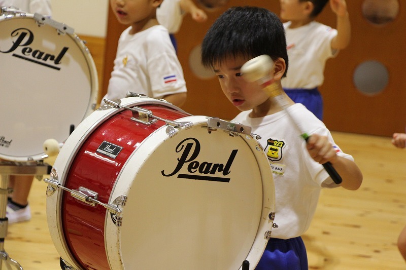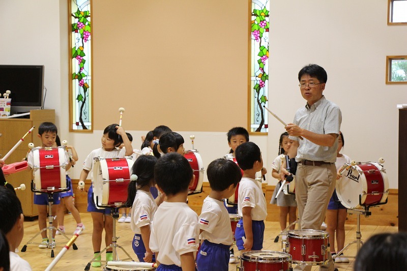 今日は、マーチング講習が持たれました。小学校グラウンドでの練習予定でしたが、雨のため遊戯室での講習となりました。9月14日(土)に予定されている運動会、また慰問、そして市の行事での演奏などに向けて、みんな楽しみながらコツコツ練習に励んでいます。