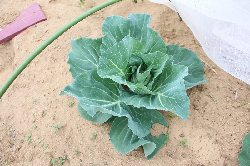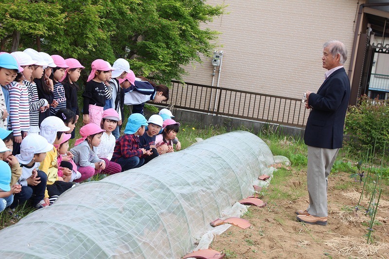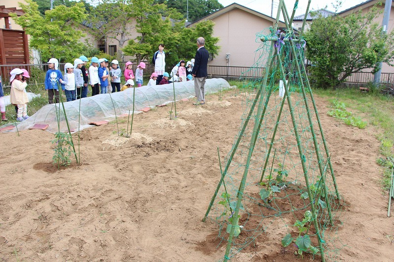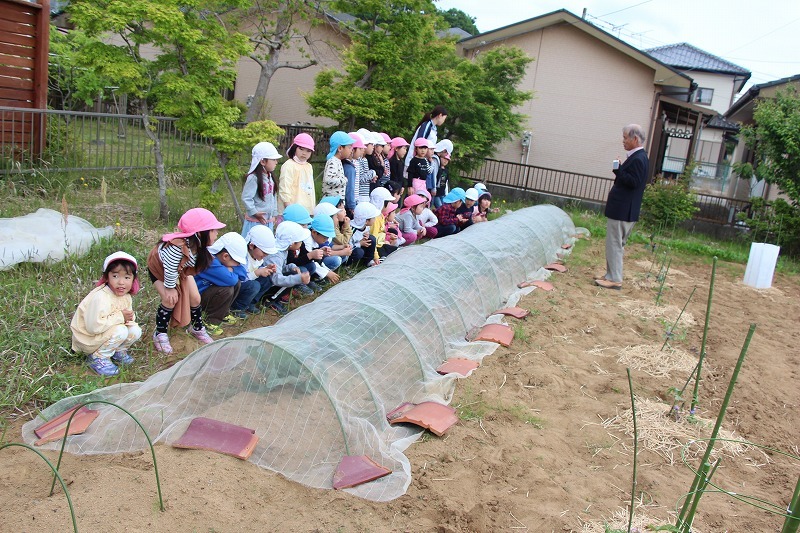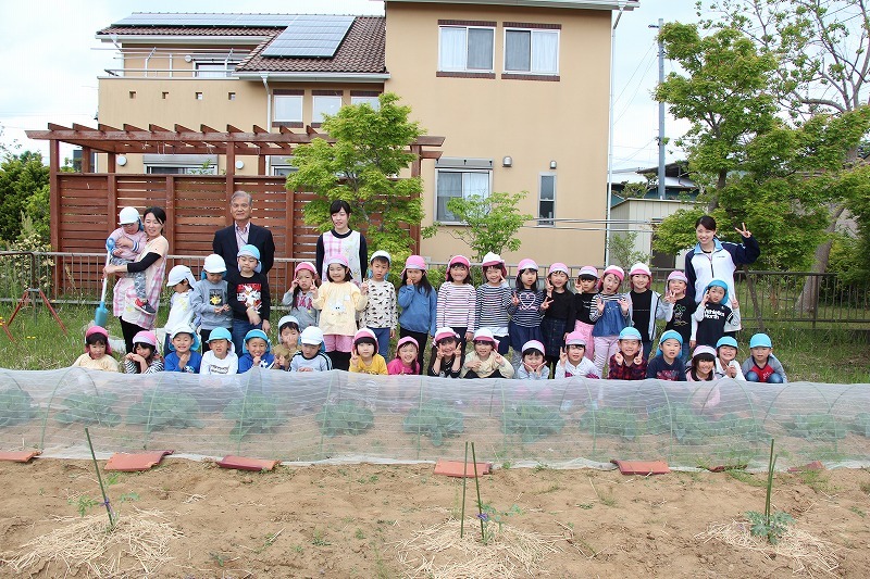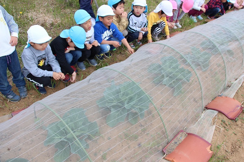 キャベツの成長をみんなで確認し、園長先生から野菜の成長についてお話を聞きました。収穫も楽しみです♪