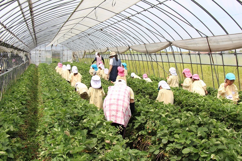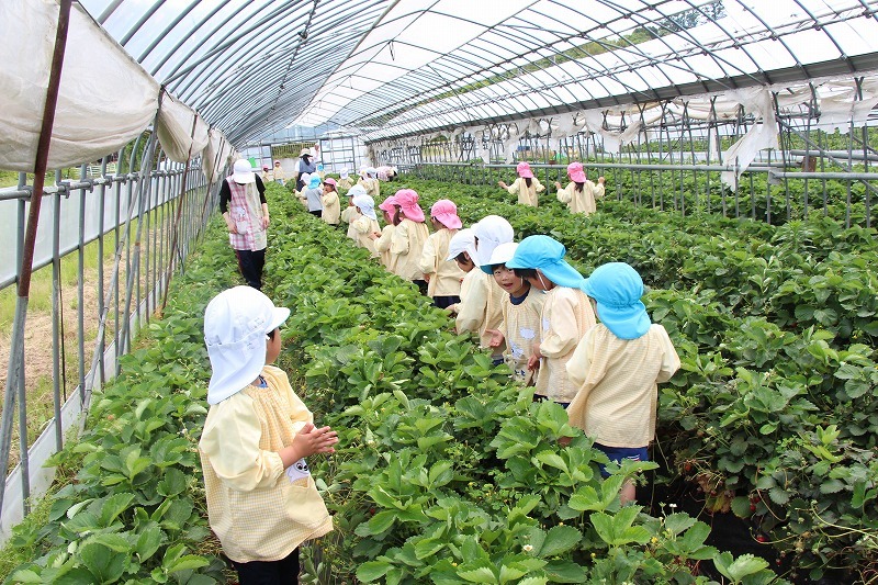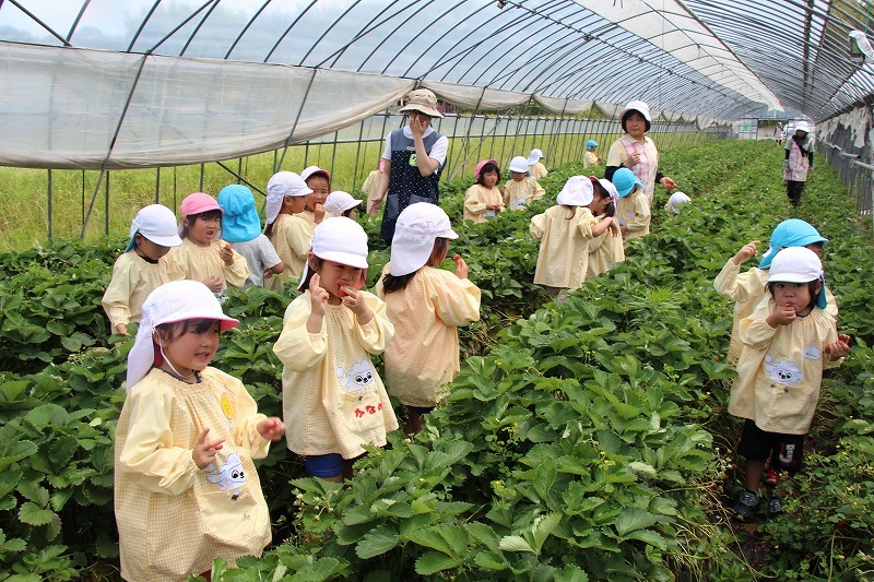 年長児、年中児はバスに乗っていちご農家さんを訪ねました。ハウスでいちご狩りを体験させて頂きました。とっても美味しかったね♪
