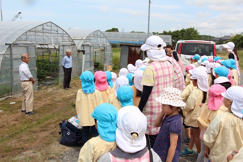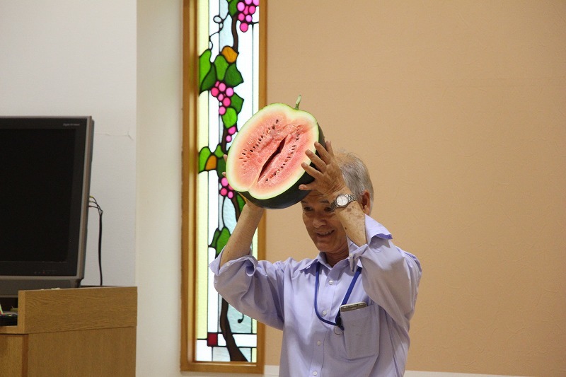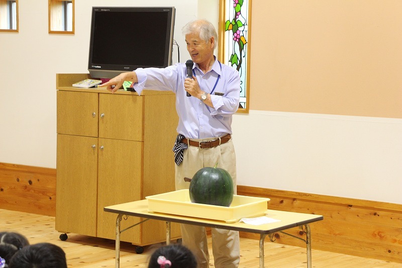 こひつじ菜園にスイカが実りました。園長先生からスイカのお話を聞いて、実際に切って中身を見たり、食育のひと時でした。英語クラスを担当して下さっていた先生がアメリカに帰国されるため、みんなで集合写真♪
