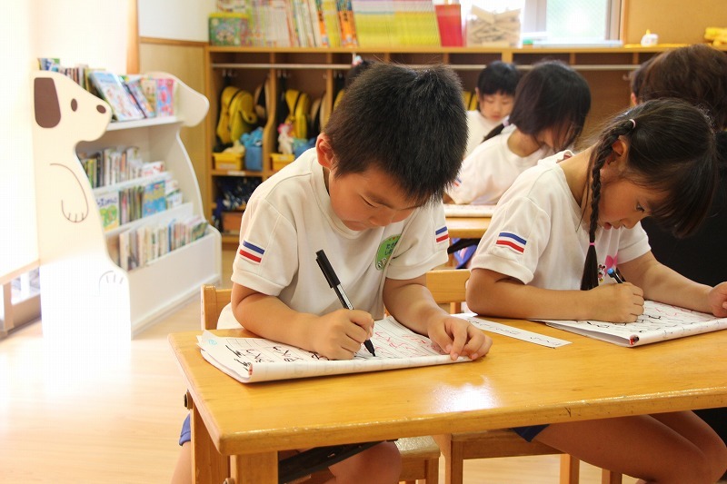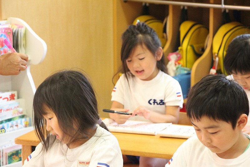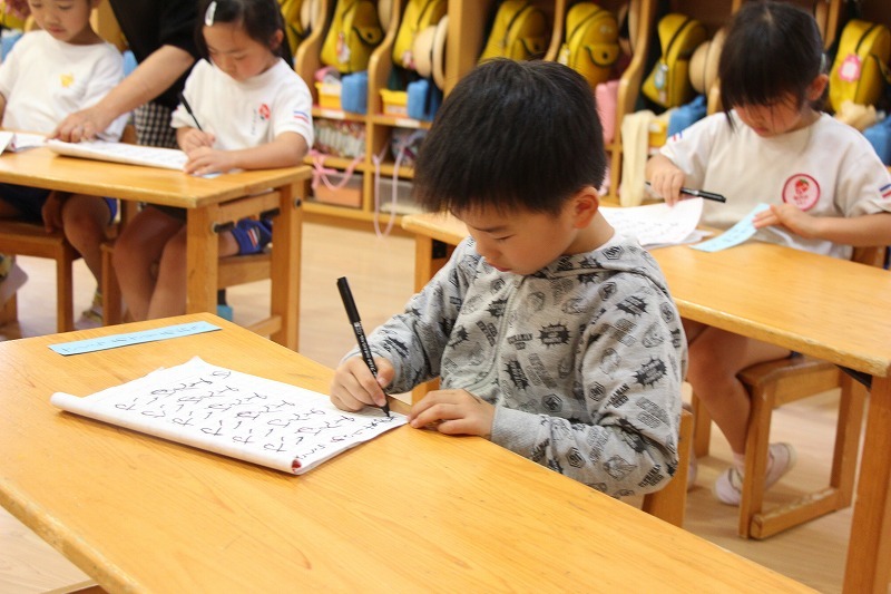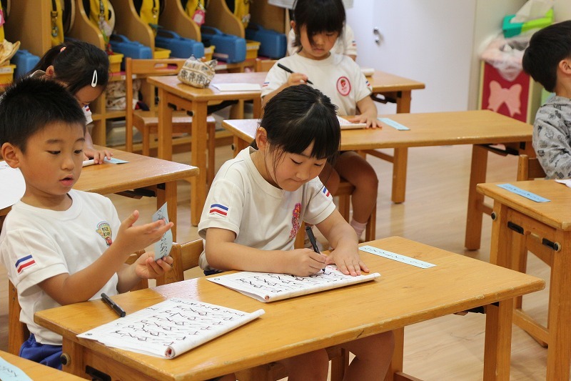 年長児は、ペン字講習がありました。講師の先生から平仮名やカタカナを学んでいます。11月からは、年中児もペン字がスタートします。