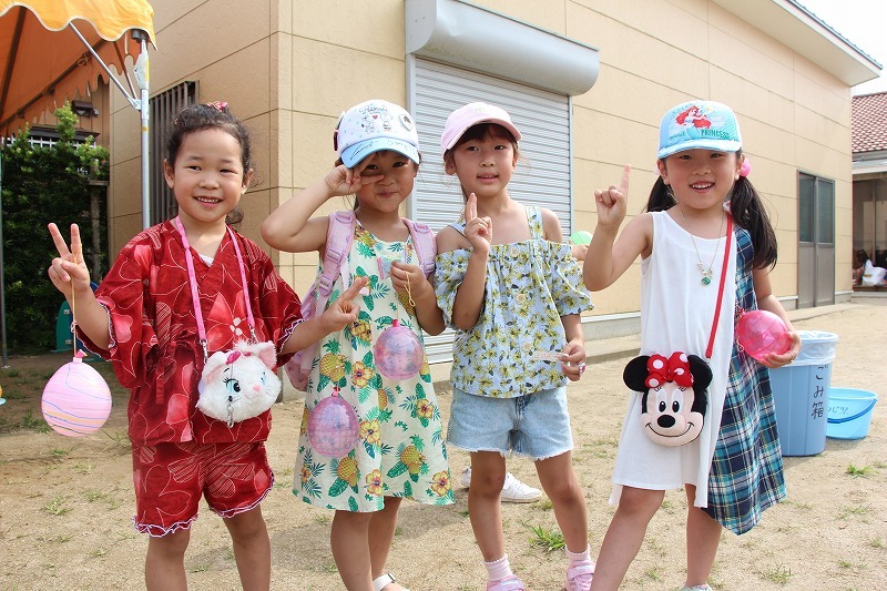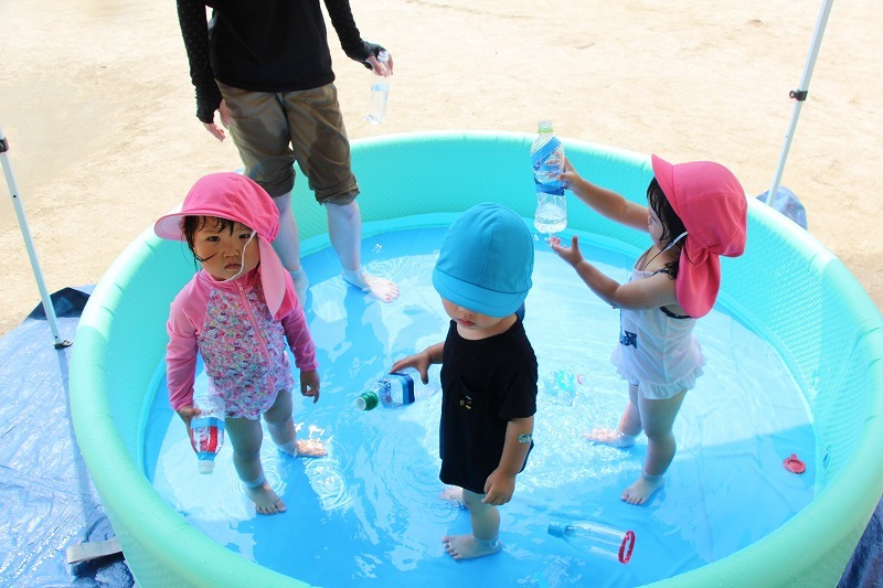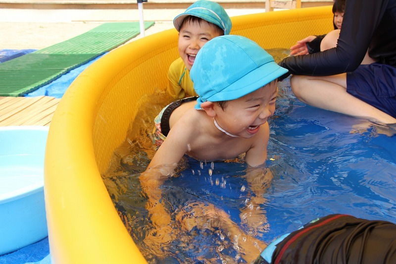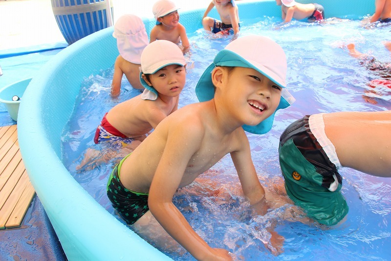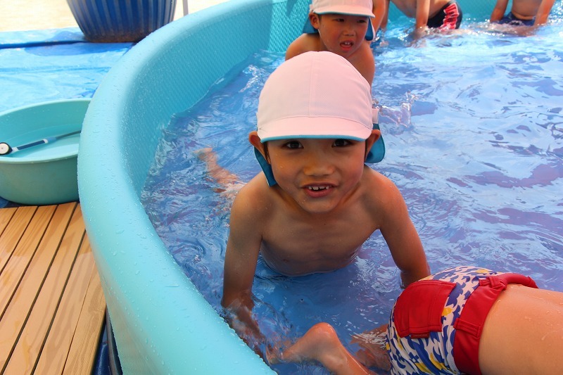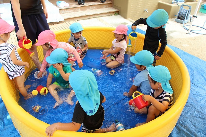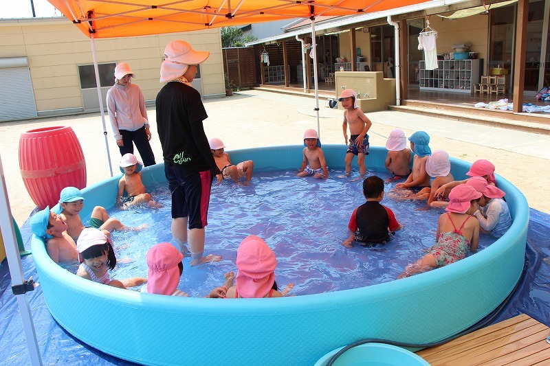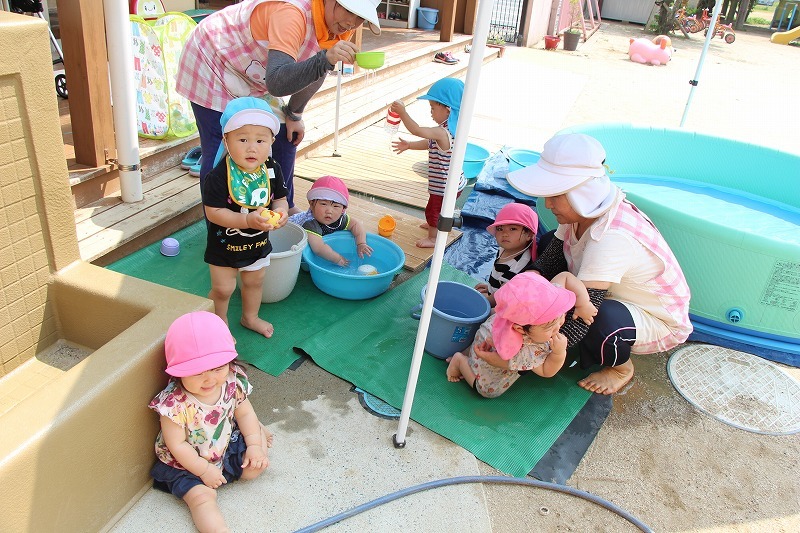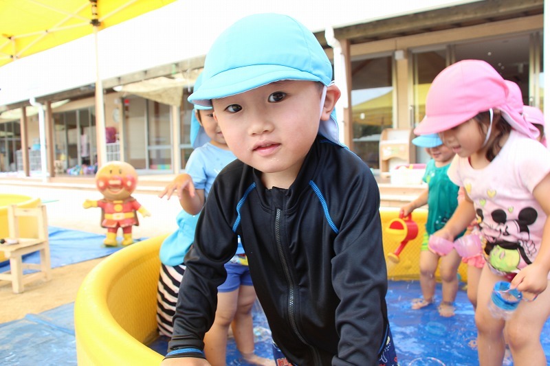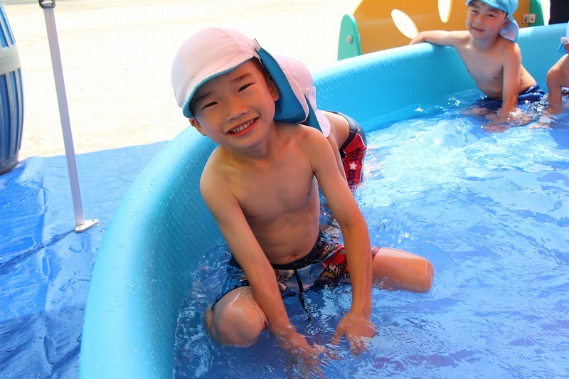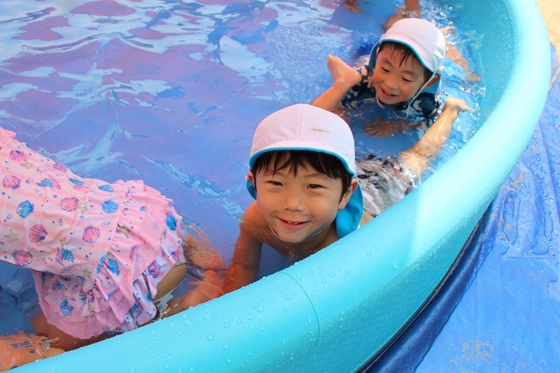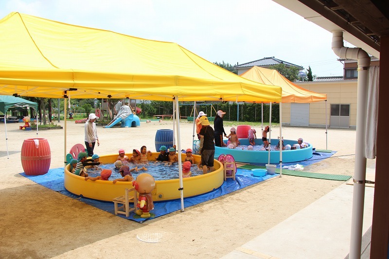 梅雨が明けて暑い毎日、子どもたちはプールで水遊びを楽しみました。熱中症対策のため、テントを出しての水遊び。とっても楽しそうでした♪