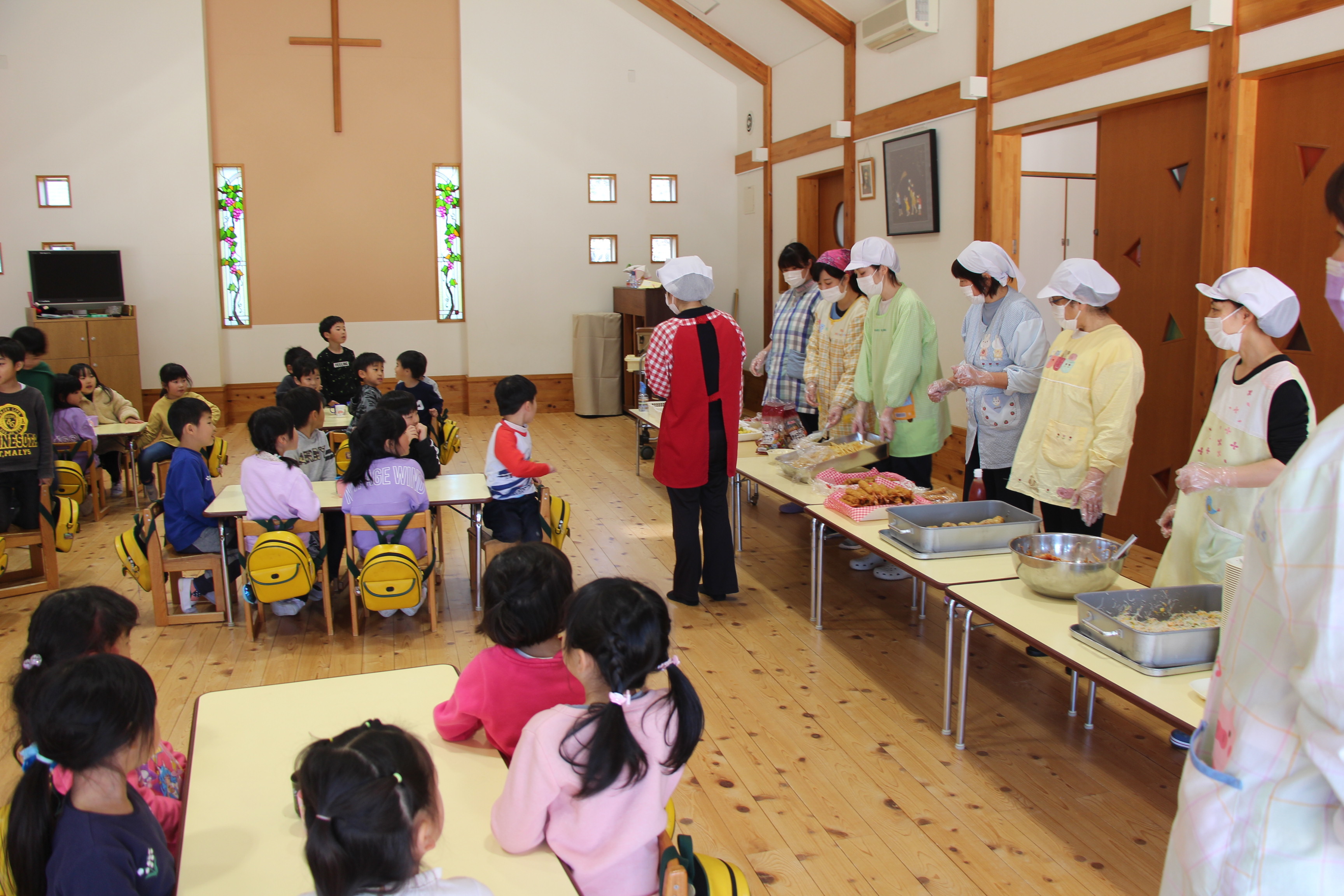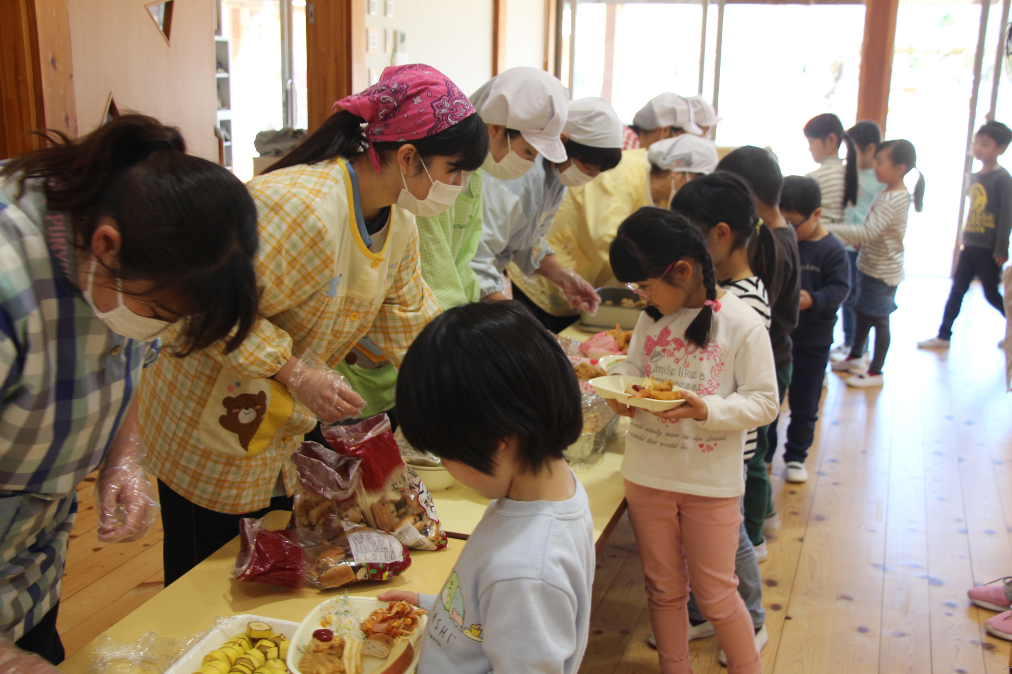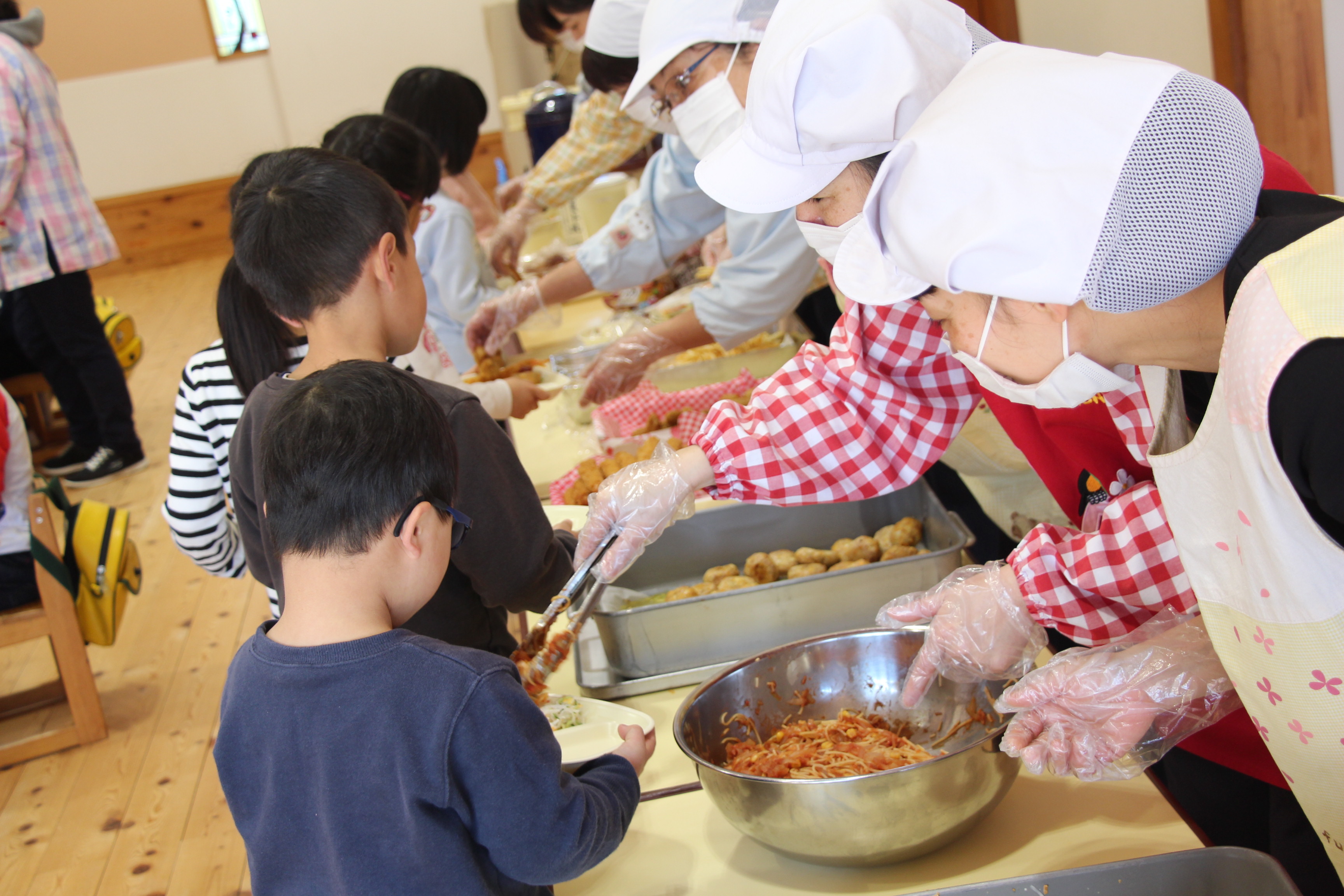 新型コロナウィルス感染予防のために、こひつじ園でも取り組んでいます。毎年、3月に「お別れバイキング給食」(以上児3クラス)を行っていましたが、今年はさくら組のみのバイキングとなりました。他クラスはそれぞれの教室でのバイキングメニュー給食となりました。