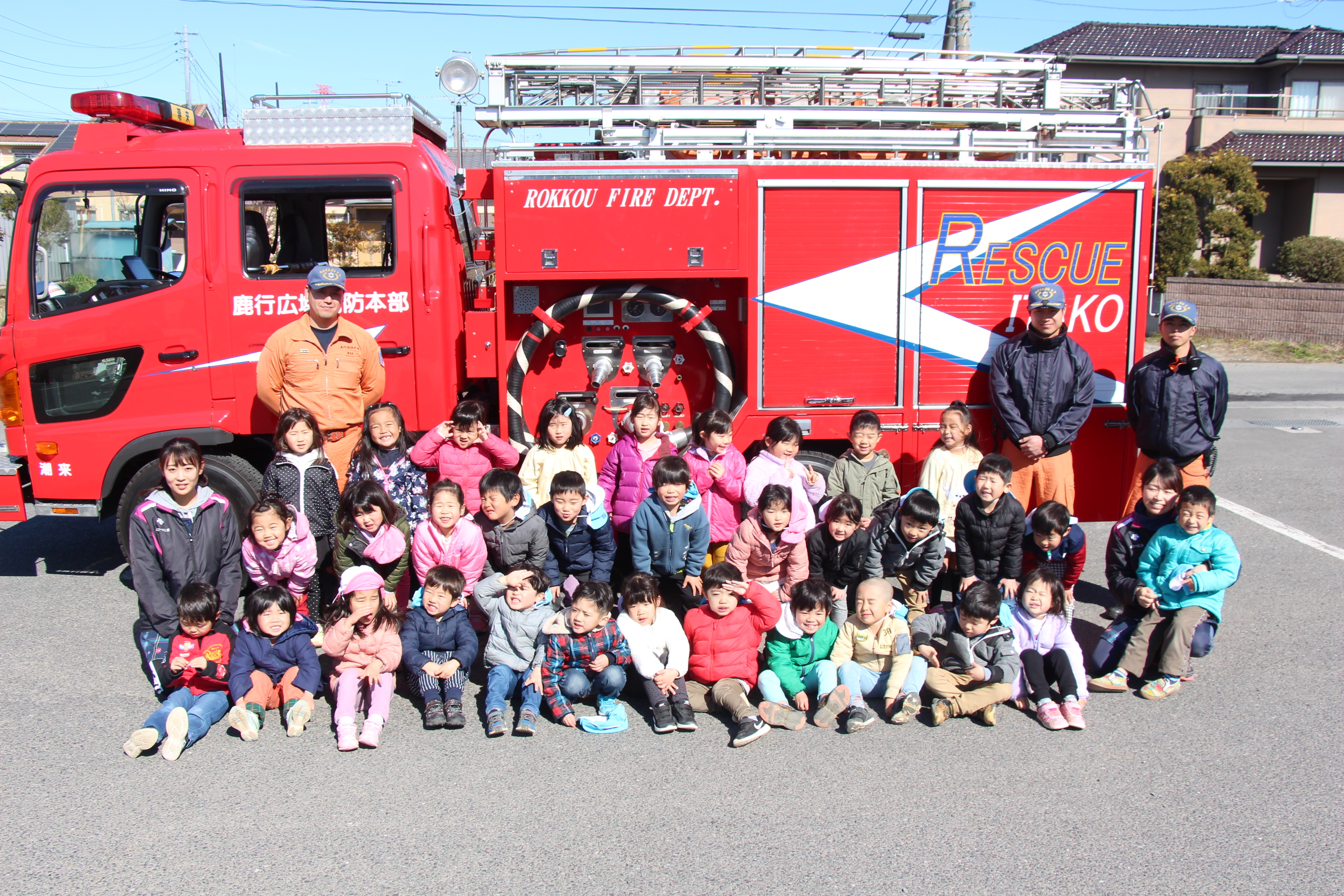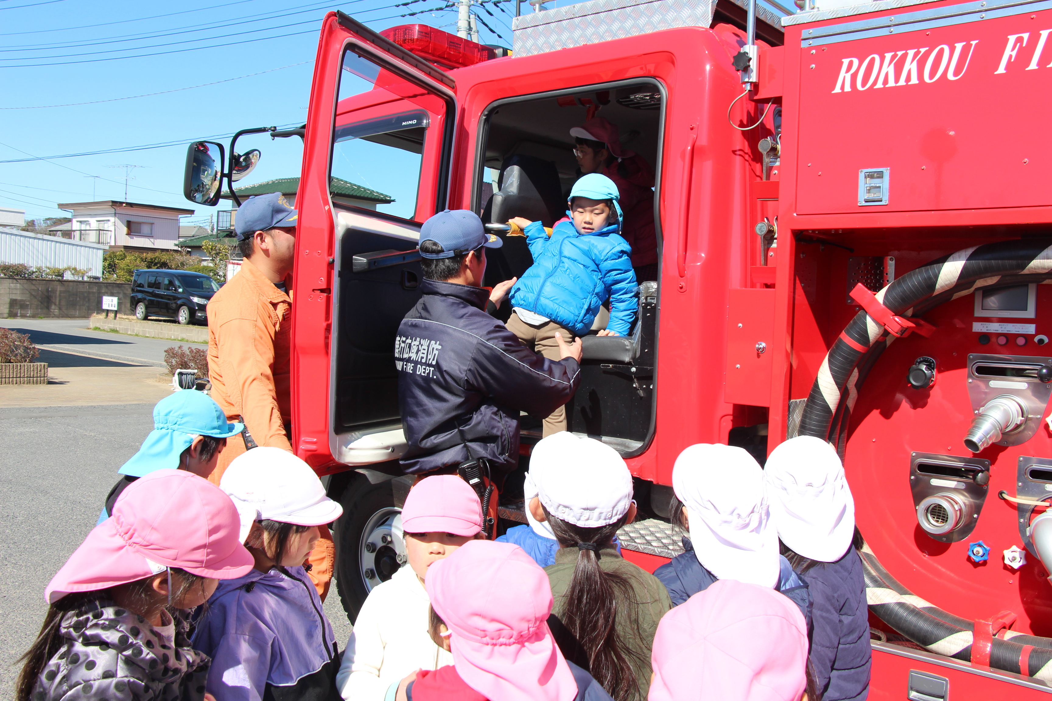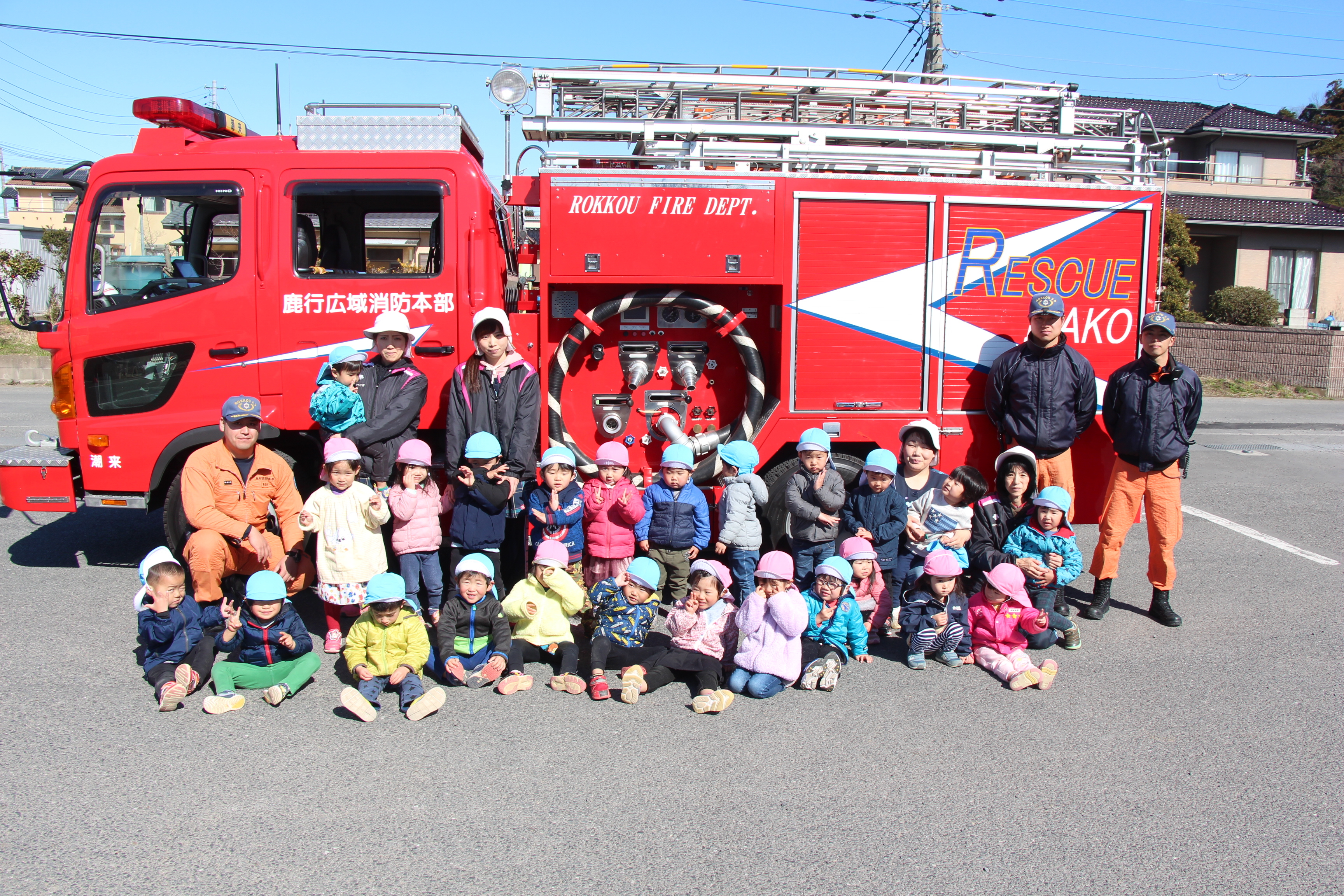 毎年この時期に、避難訓練のために消防士さんが消防車に乗って来園されます。今回も、毎月行っているように非常ベルを鳴らし、避難する様子も確認して頂き、お話して頂きました。職員による消火訓練も見た後、消防車の前で記念撮影。消防士さんの帽子などかぶらせて頂いたり、貴重な経験をさせて頂きました!