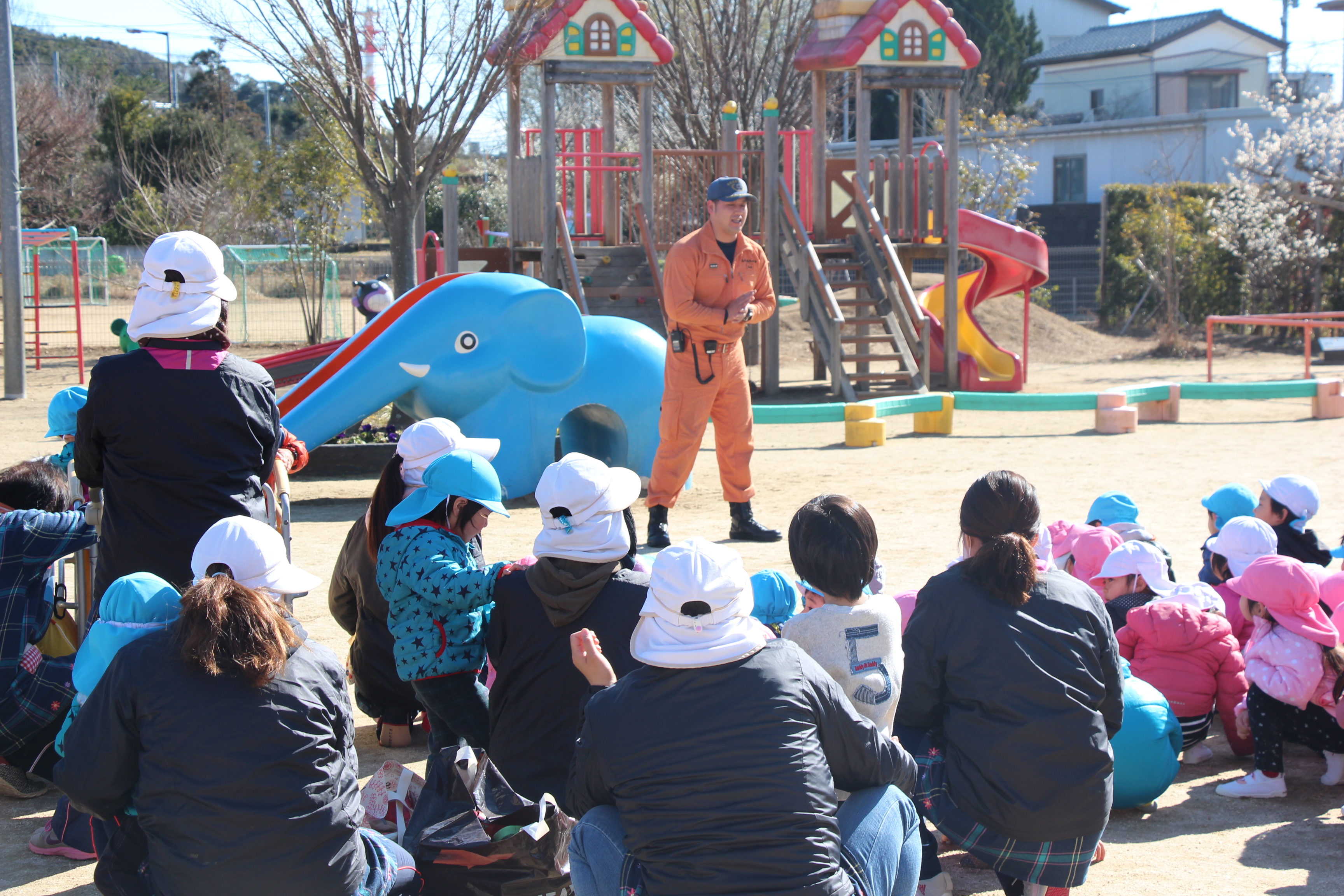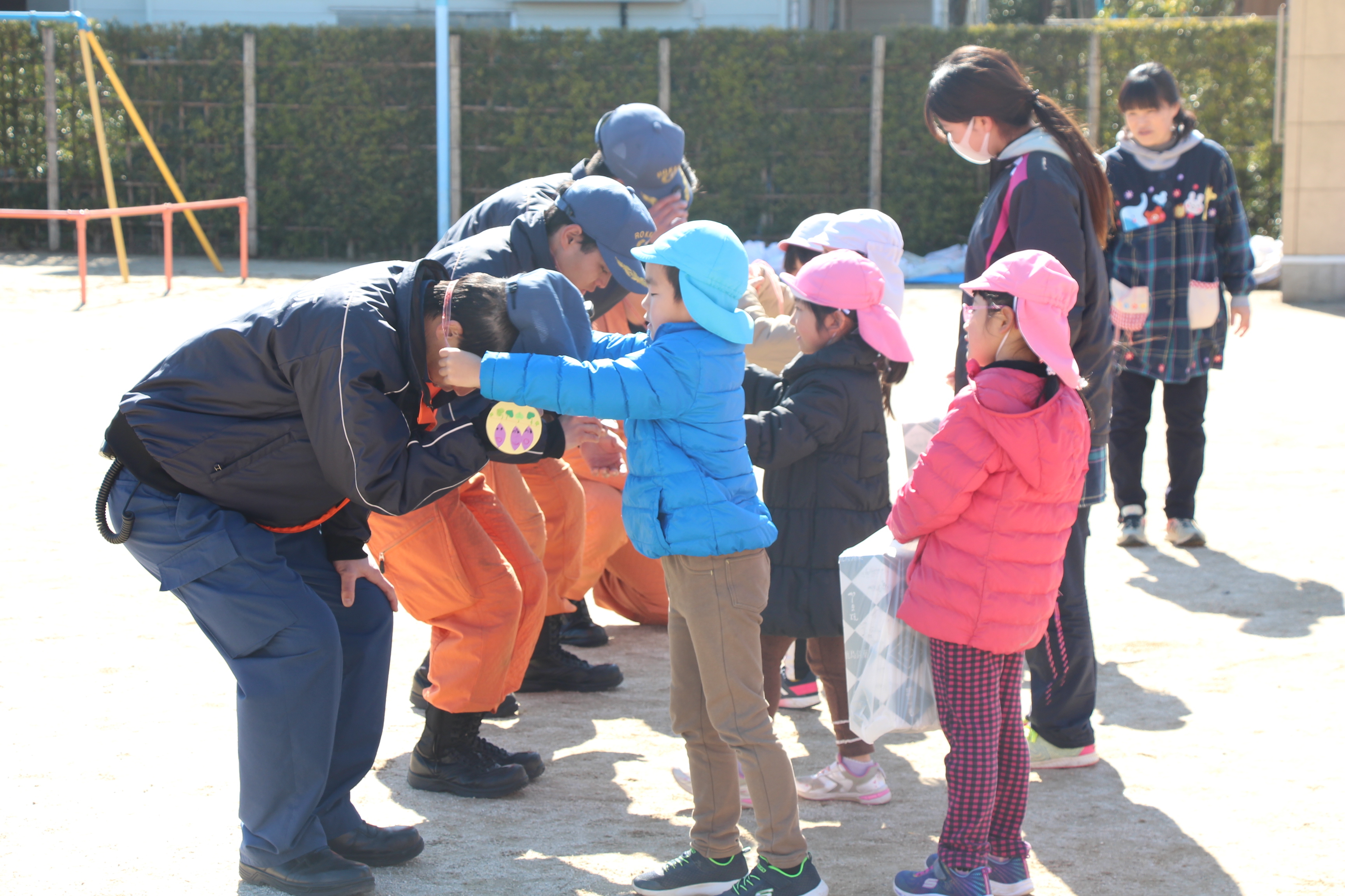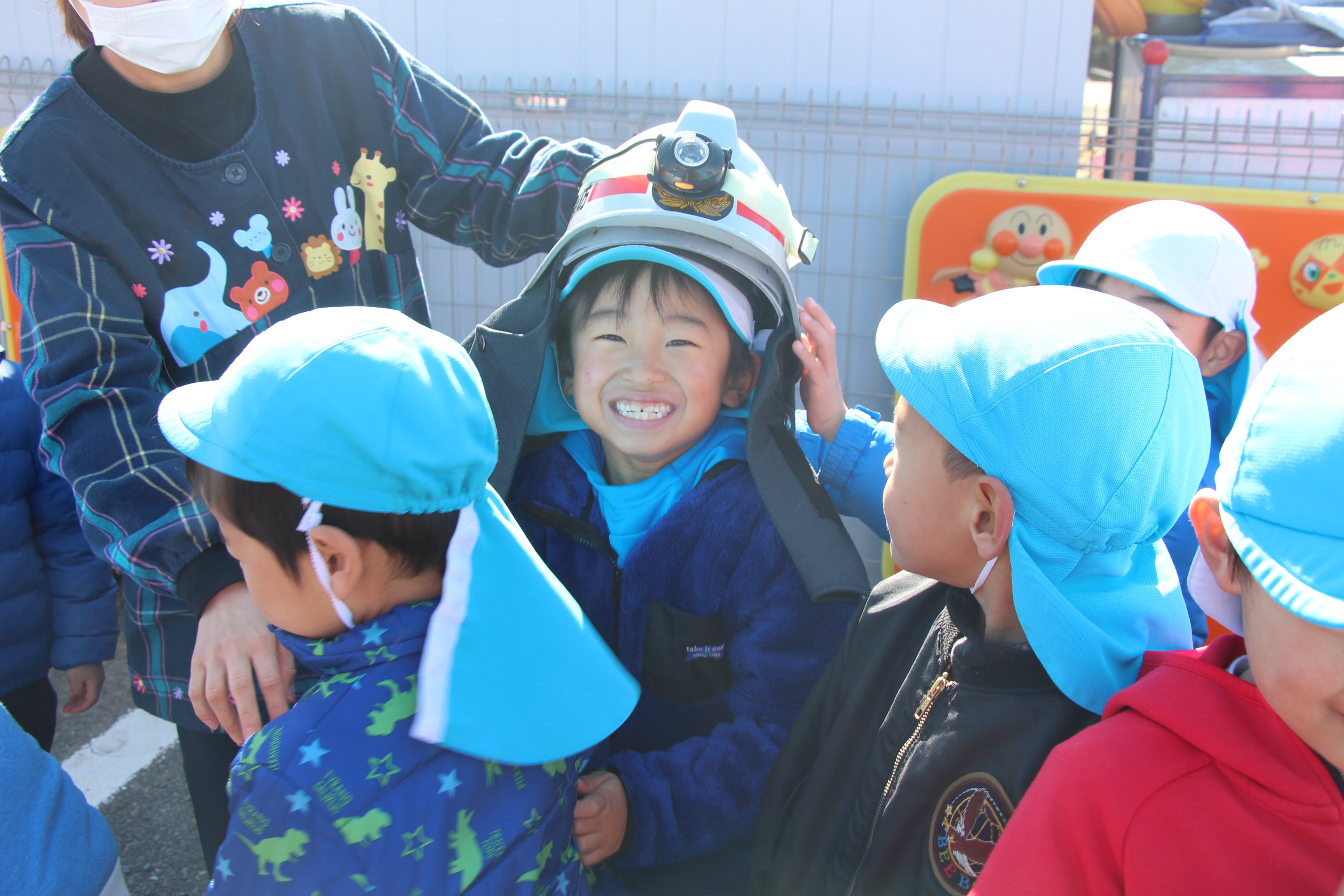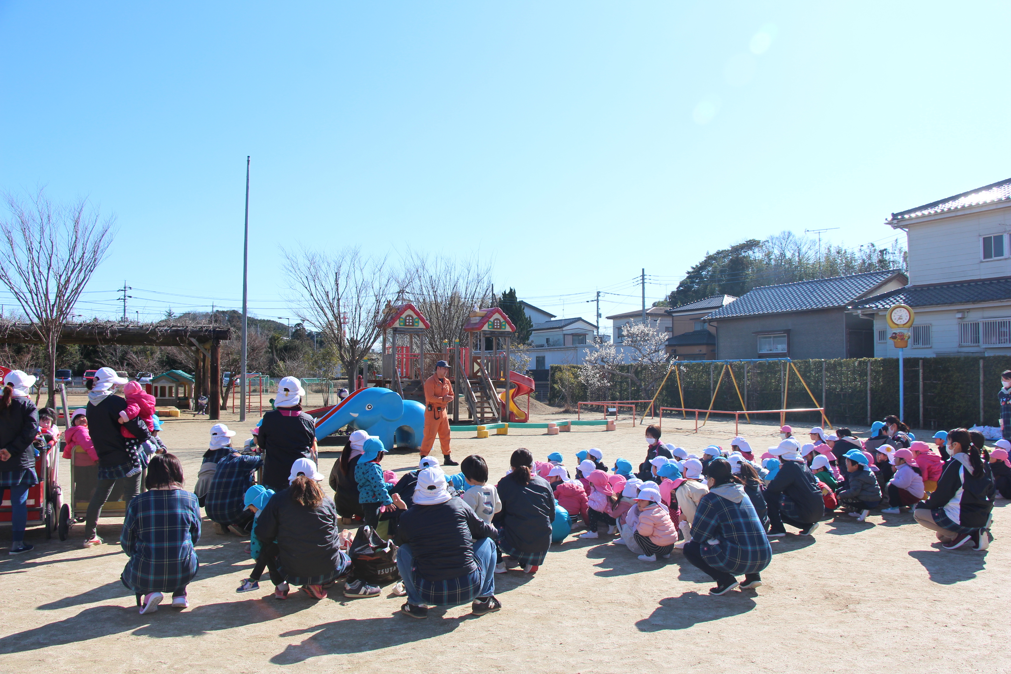 毎年この時期に、避難訓練のために消防士さんが消防車に乗って来園されます。今回も、毎月行っているように非常ベルを鳴らし、避難する様子も確認して頂き、お話して頂きました。職員による消火訓練も見た後、消防車の前で記念撮影。消防士さんの帽子などかぶらせて頂いたり、貴重な経験をさせて頂きました!