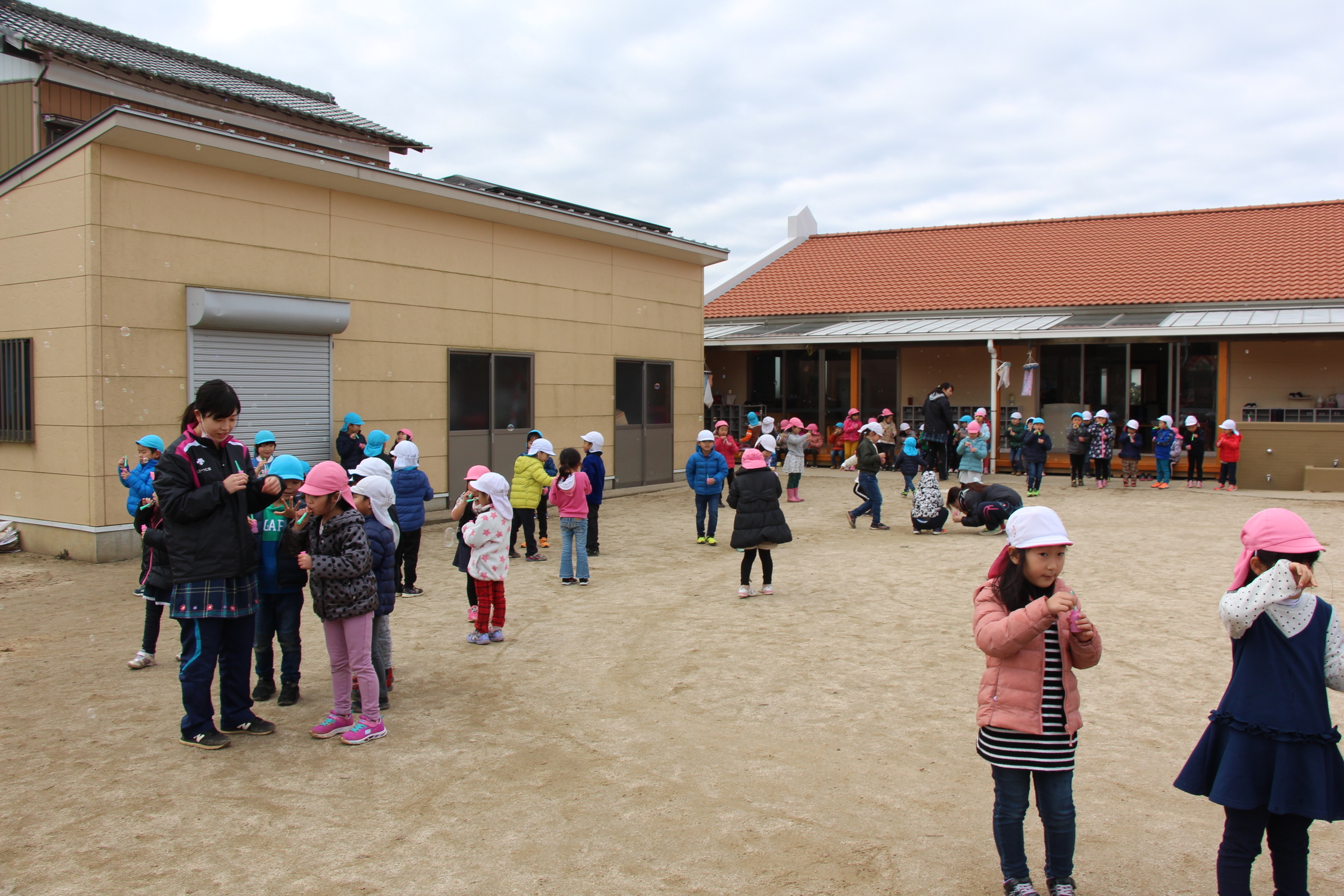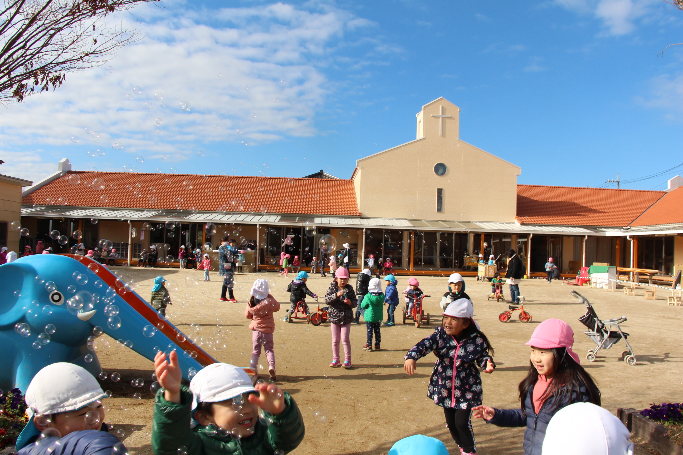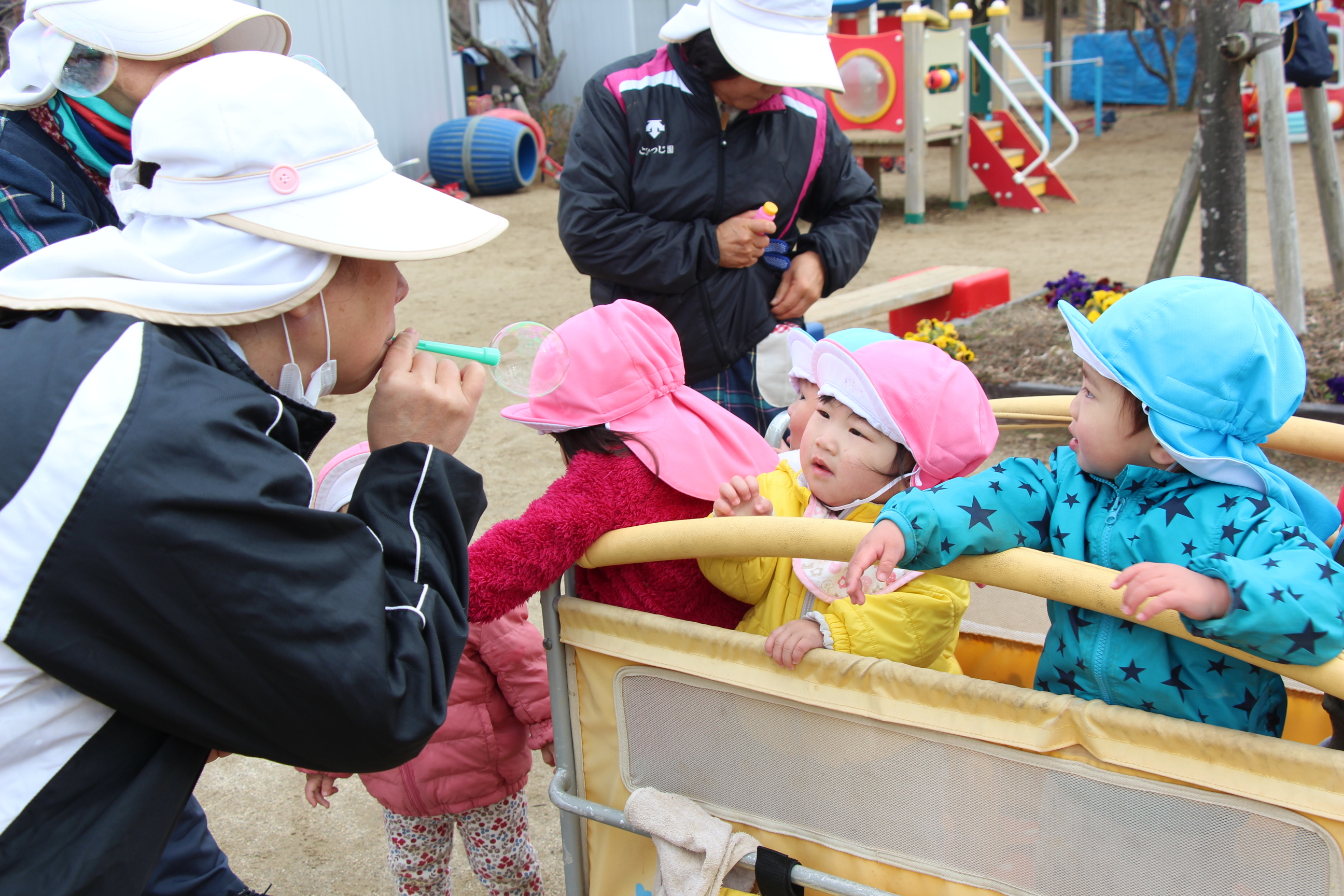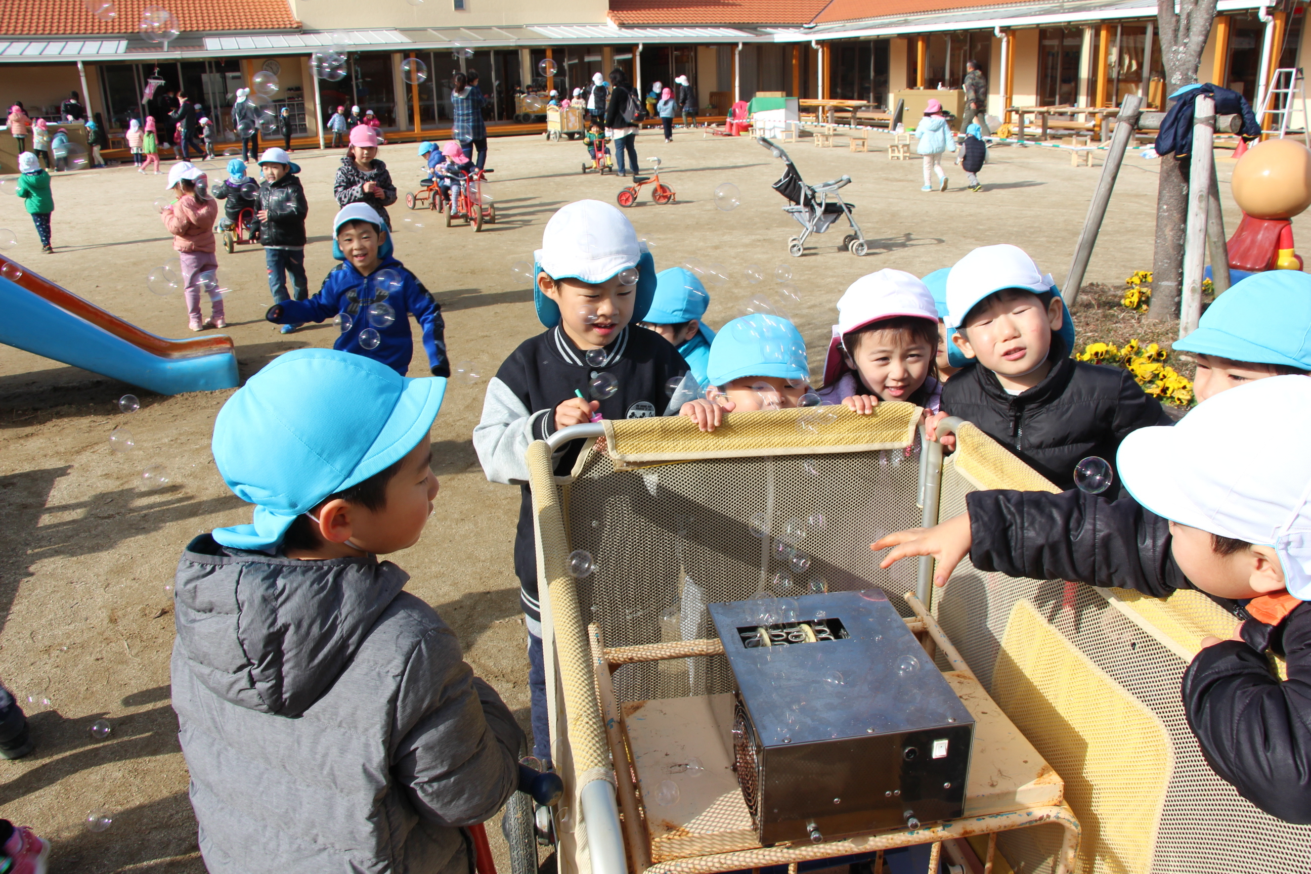 園庭でシャボン玉大会が持たれました。みんなでいっぱいのシャボン玉を膨らませて空に飛ばしました♪シャボン玉機から噴き出てくる沢山のシャボン玉に、子どもたちも大喜び!青空のもと、楽しいひと時を過ごす事が出来ました♪