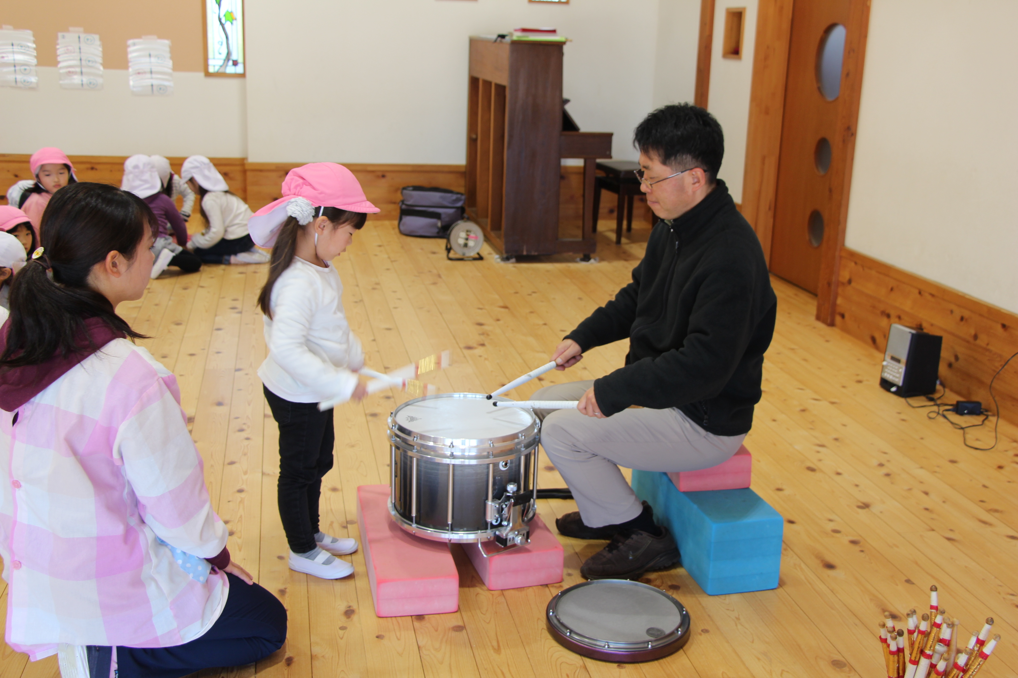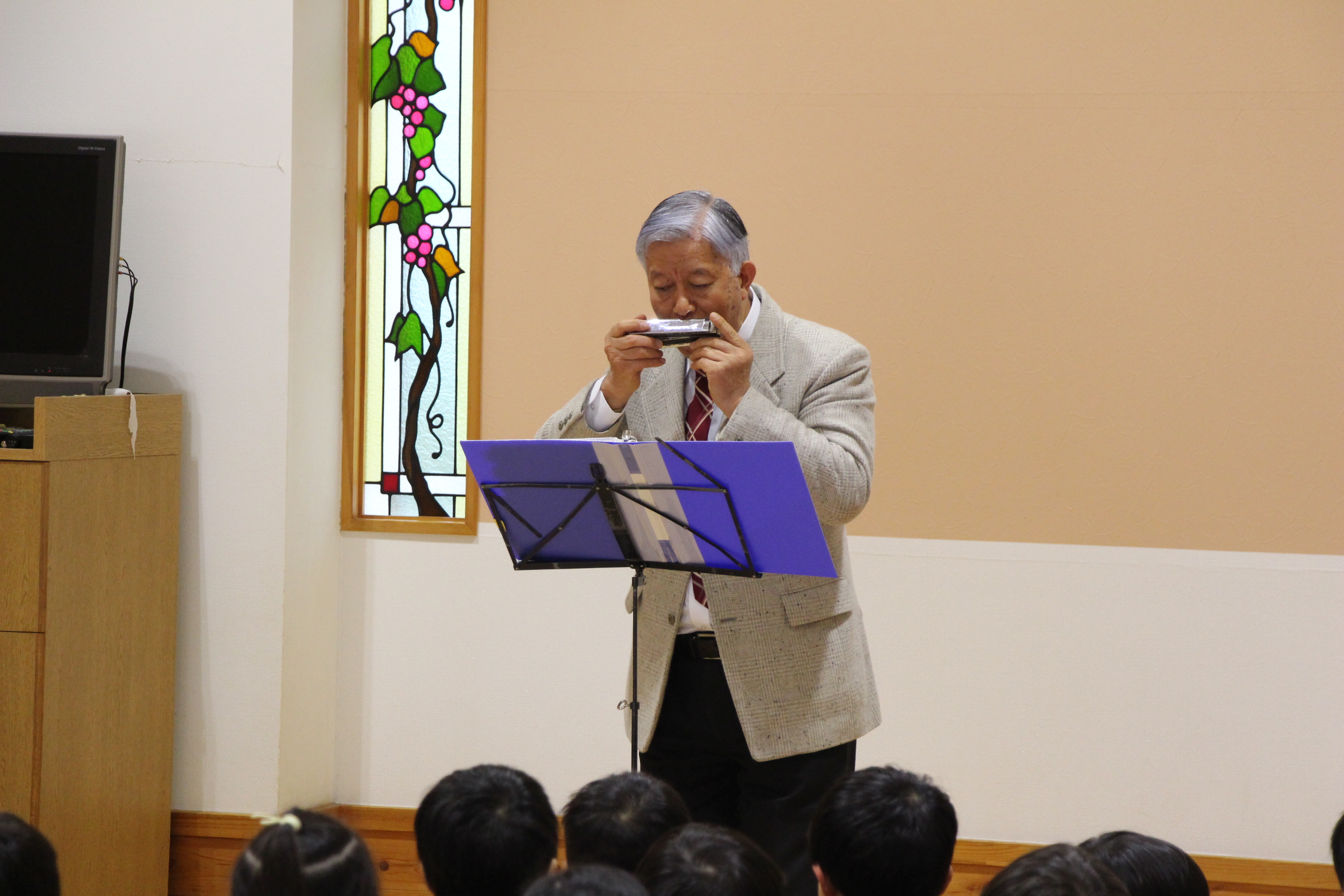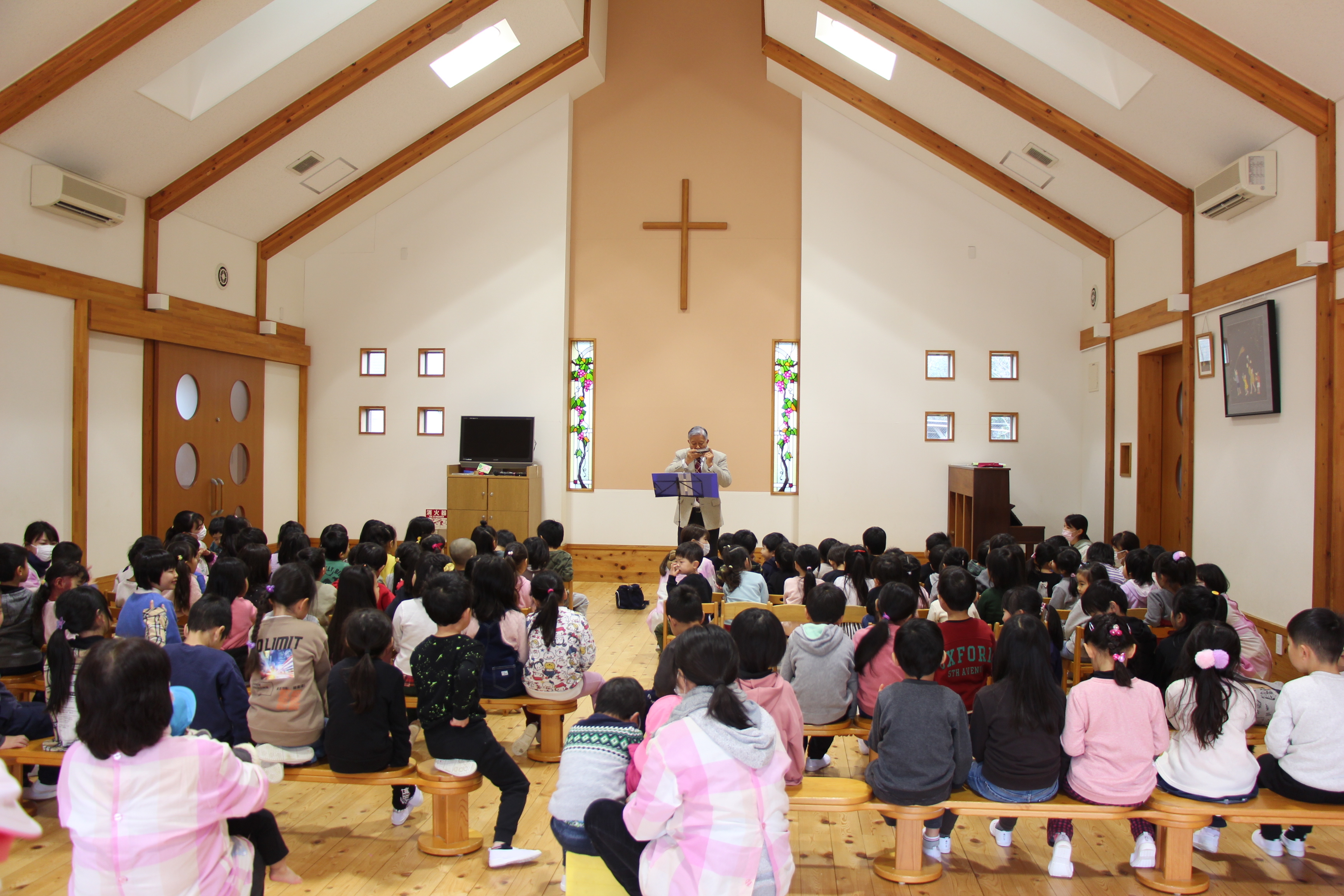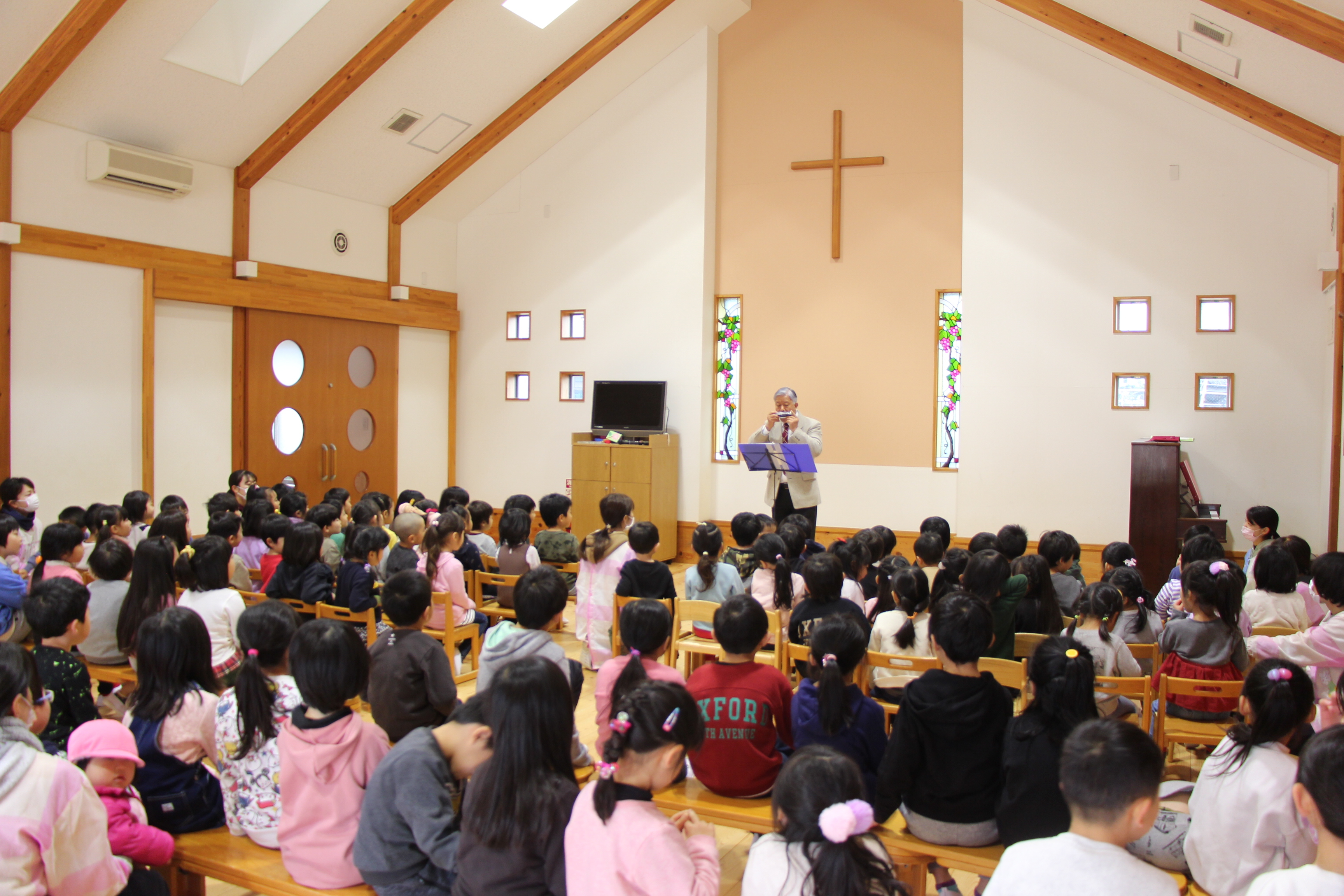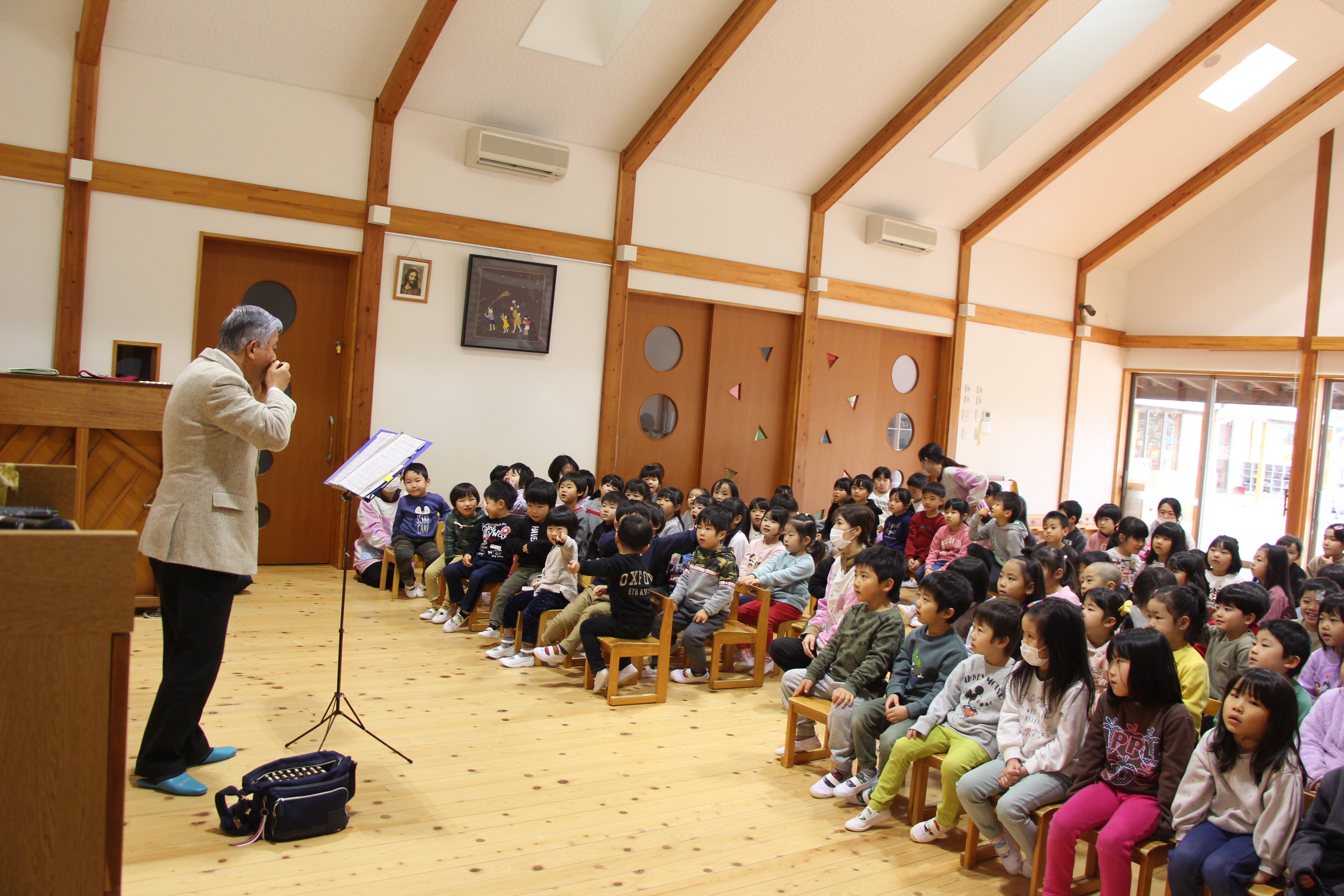 毎年恒例のハーモニカ演奏会です。知っている曲が演奏されるとみんな元気いっぱいに歌っていました。年長児はハーモニカの練習をしているので、興味深く演奏に聴き入っていました♪