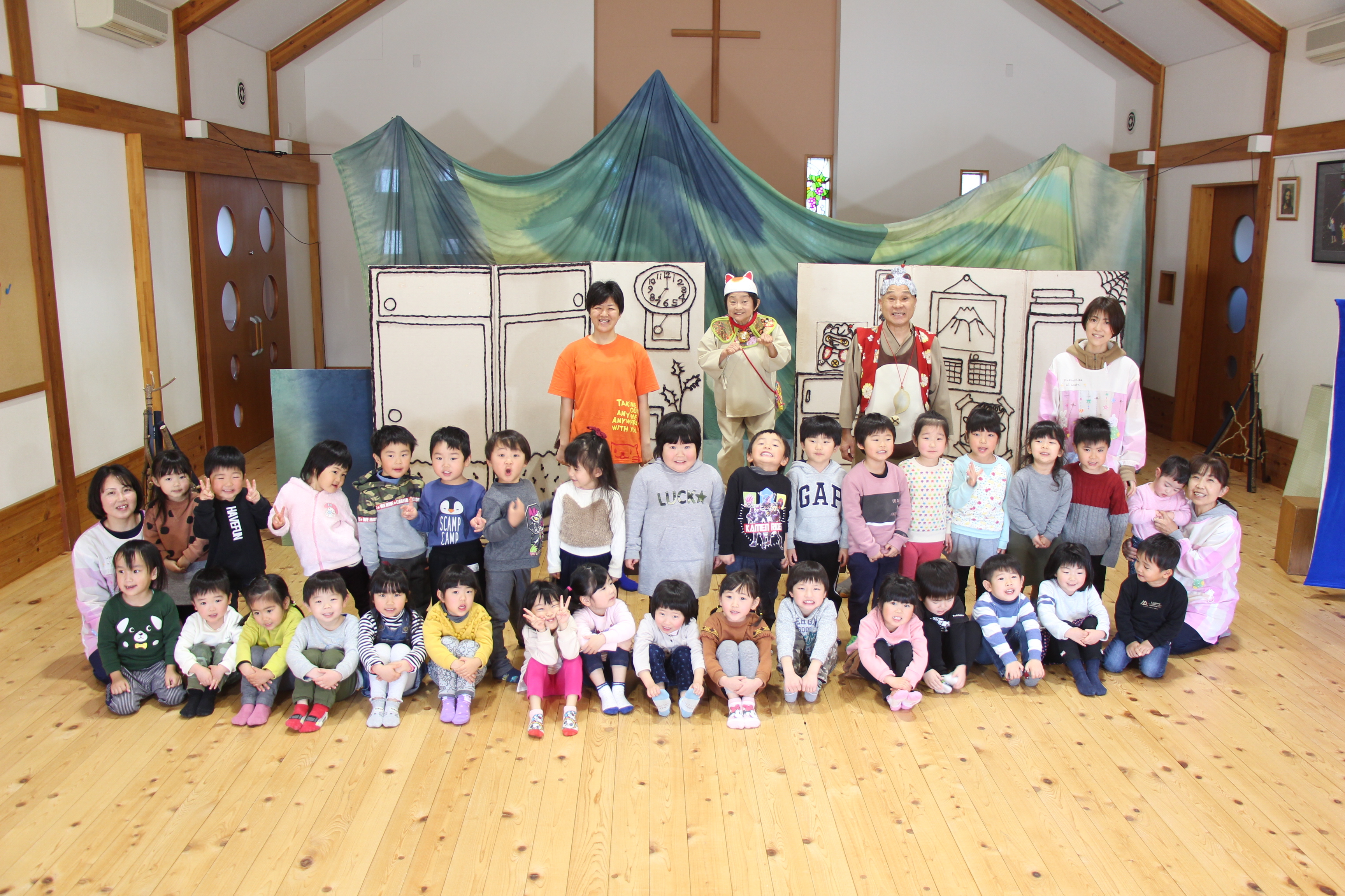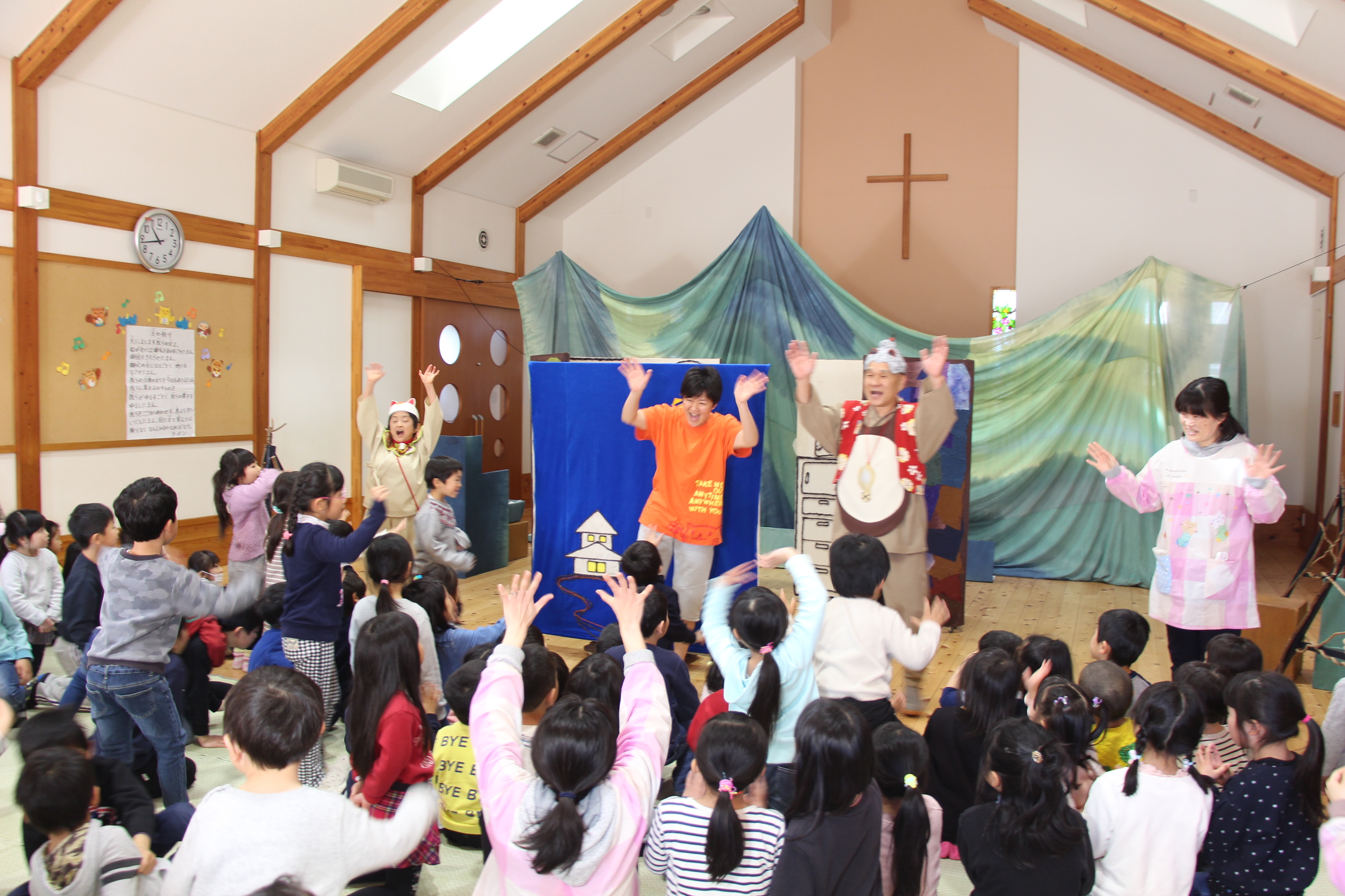 感染症予防のため、親子での観劇は出来ず、またすくすくラミーの参加も中止となりましたが、以上児3クラスが観劇を楽しみました♪楽しい音楽に演者さんたちのコミカルな動き、そしてオリジナルストーリーはとっても面白く、子どもたちも集中して観劇していました♪