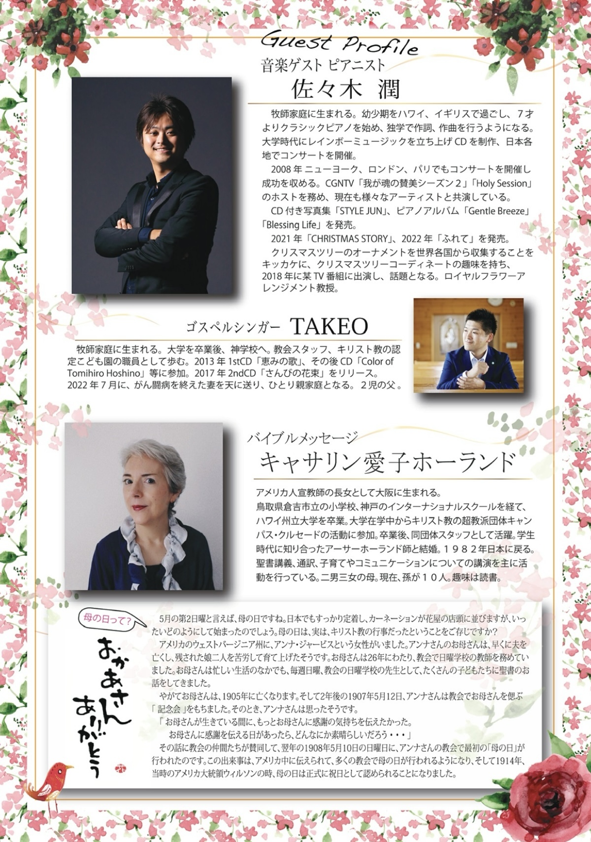 さくら組が子ども聖歌隊でゲスト出演します。バイブルメッセージは、キャサリン愛子ホーランド先生が来てくださいます。音楽ゲストは、pianist 佐々木潤氏です。心から歓迎いたします!