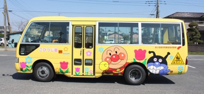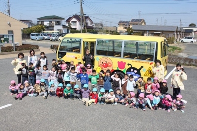 この園児バスは、赤い羽根共同募金の助成を受けて購入致しました。みんなとても喜んでいます。心から感謝いたします。
