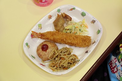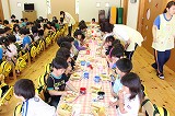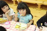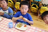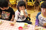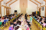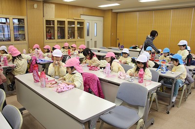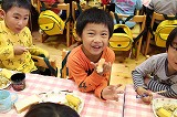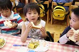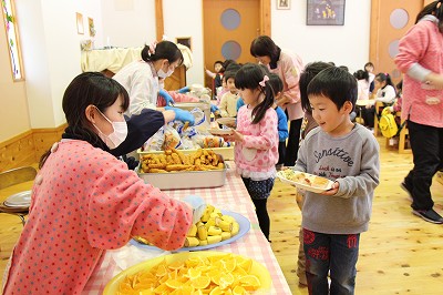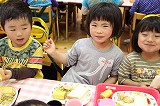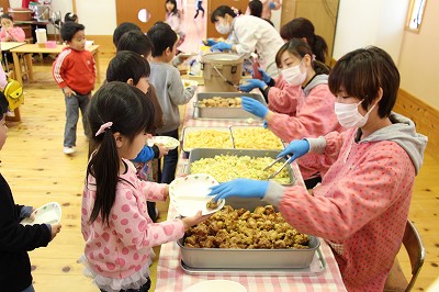お別れバイキング給食です。もうすぐ卒園する年長児さんたちと一緒に、遊戯室で給食を頂きました。バイキングなので、好きなメニューのお代わりも楽しんで美味しく頂くことが出来ました!