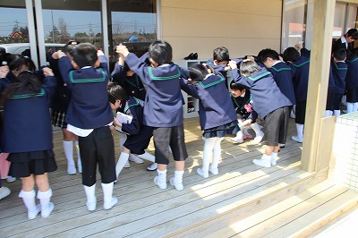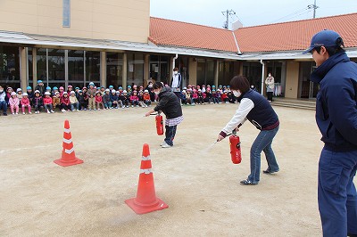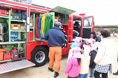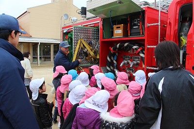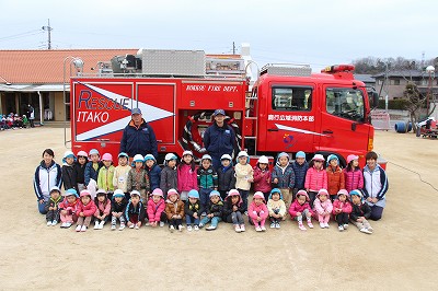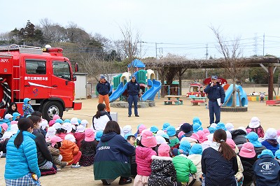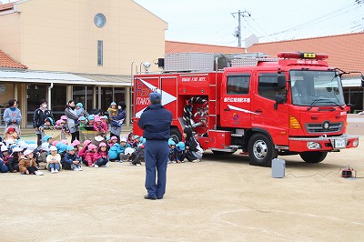 毎月行っている避難訓練、今月は消防士さんが消防車に乗って指導して下さいました。消防士さんのお話によく耳を傾けて聞くことも出来ましたね。記念写真も撮影し、またいつもは見ることの出来ない消防車の中も見せて頂きました。