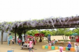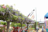 園庭は春の彩りをみせています。藤棚では、藤の花が見事に咲いています。木々の新緑の清々しさを感じますね。子どもたちは、この自然に触れながら、体いっぱい動かして、日ごとに自由遊びを経験しています。