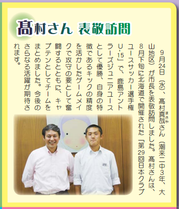 広報潮来の10月号に、卒園児の高村君の写真が掲載されていました。8月下旬に北海道で開催された「第29回日本クラブユースサッカー選手権U-15」で、鹿島アントラーズジュニアユースとしてキャプテンとして出場、自身の特徴であるキックの精度を活かしたゲームメイクで攻守の要として活躍されました!心からおめでとうございます!