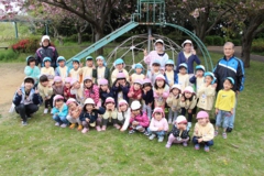 とっても良い天気、あるクラスは芝山で集合写真を撮影しました。小さいクラスもみんな思い思いの遊びを楽しんでいました。入園時は歩けなかったひよこ組のみんなも、靴を履いて元気に遊んでいます♪