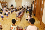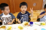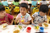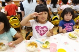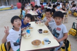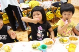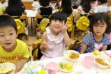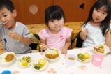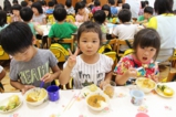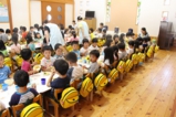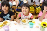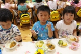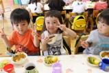 年少〜年長児さんは、遊戯室でこひつじレストランです。いつも美味しい給食をみんな沢山食べています。おかわりの時も沢山の子どもたちが並んでいました。みんなで一緒に食べることの楽しさを実感しています(^^)