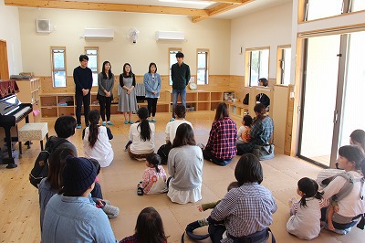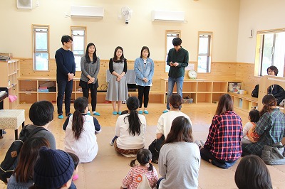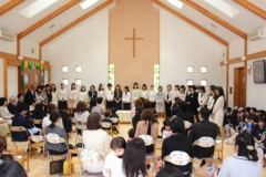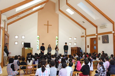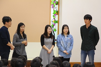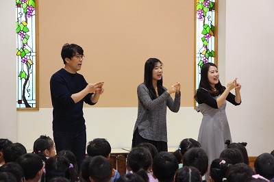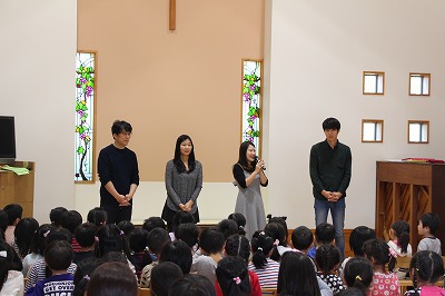 月曜の合同礼拝に、韓国よりお客さんが来園しました。2ヶ月前に来日し、関東ツアーをされていたオンギジャンイ(賛美チーム)が、園児たちのために素敵な歌を歌って下さいました。その後は、すくすくラミーの親子の前でも、同じように素敵なハーモニーで歌って下さいました。感謝★