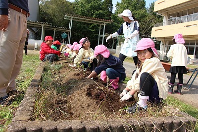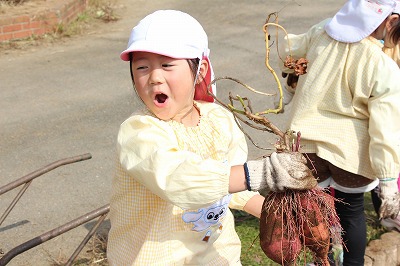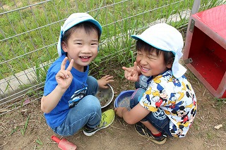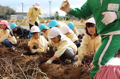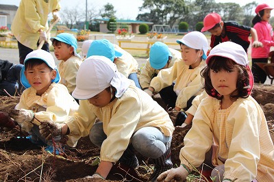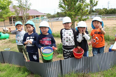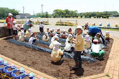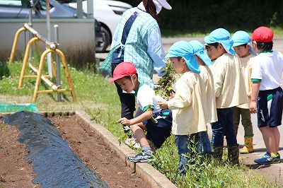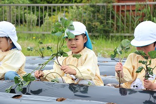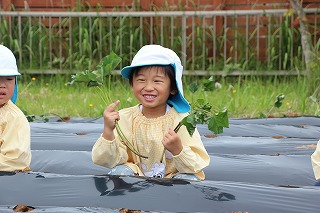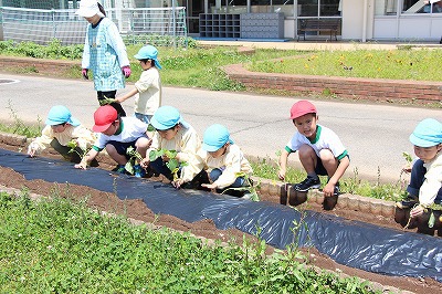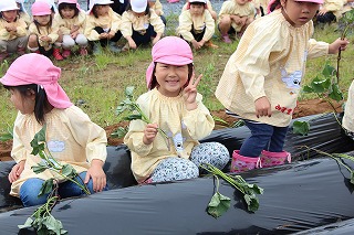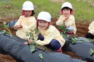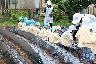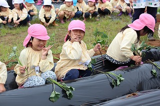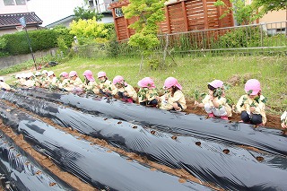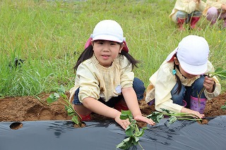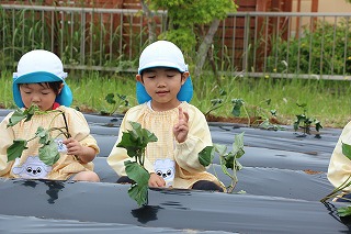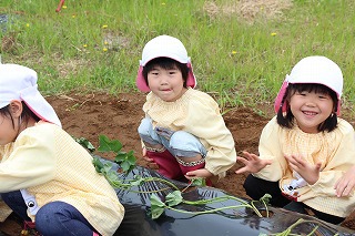 今年も、さくら組、ゆり組のみんなでサツマイモ苗を植えました。サツマイモ農家さんから立派な苗を頂いて、みんなで植えましたよ♪ 秋には、ばら組のみんなも一緒に、サツマイモ掘りです。おーきく、な〜れ!