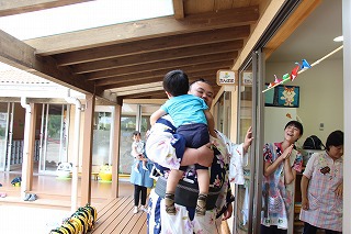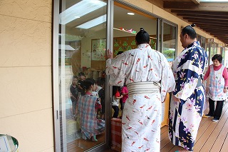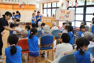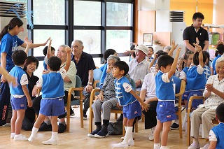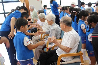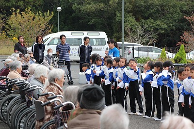 朝の雨が心配されましたが、演奏時間前には雨も上がり、沢山のおじいちゃんおばあちゃん達の前で演奏することが出来ました。今回は、さくら組、ゆり組の2クラスでの慰問となりました。演奏後は、さくら組のみんなはおじいちゃんおばあちゃんと一緒に楽しい一時を過ごすことが出来ました。感謝★