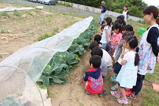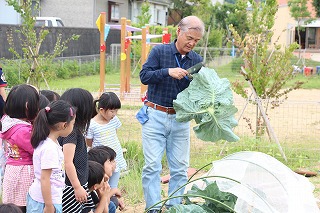 食育の一環で、園長先生が野菜などを育ててくれています。キャベツが出来たので、さくら組の子どもたちと収穫しました♪