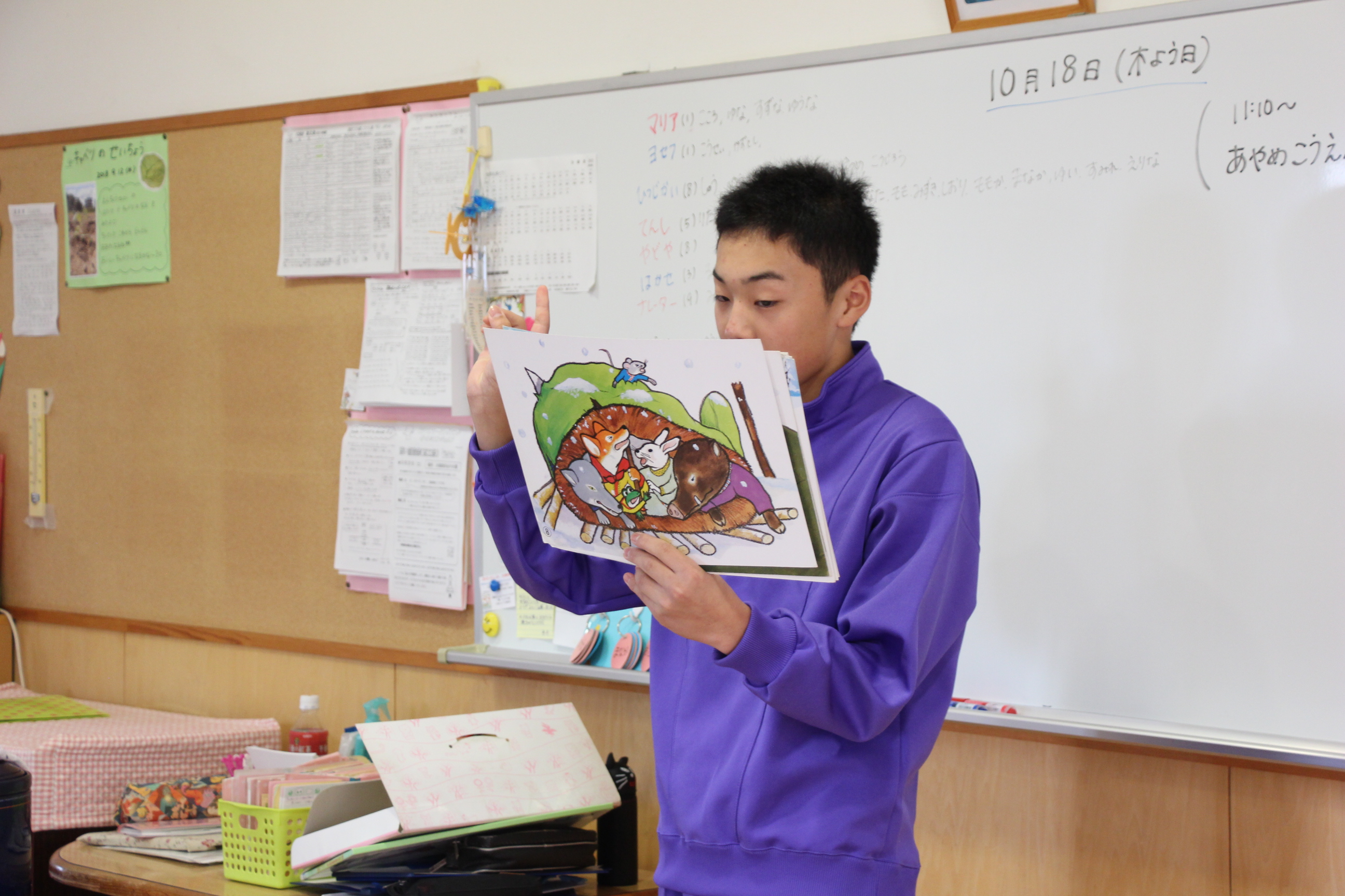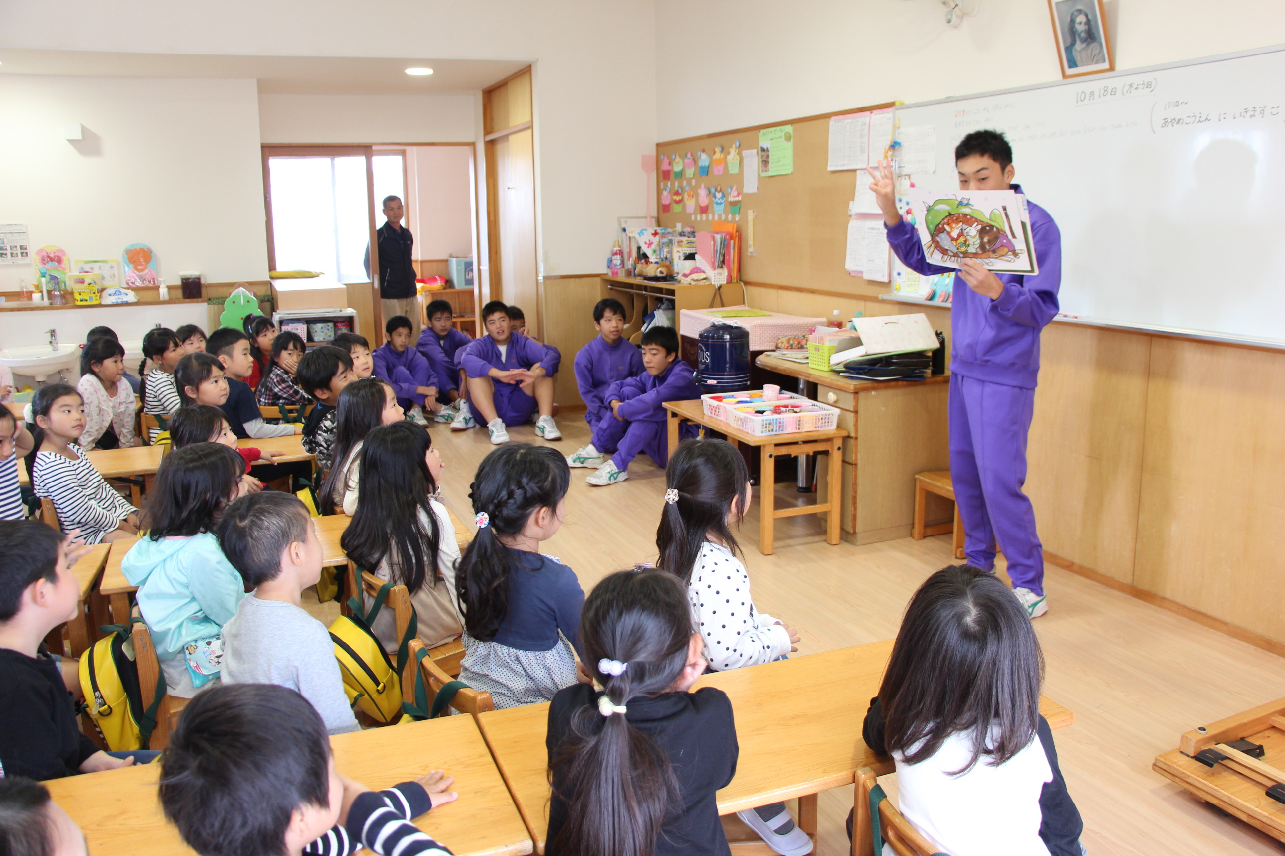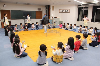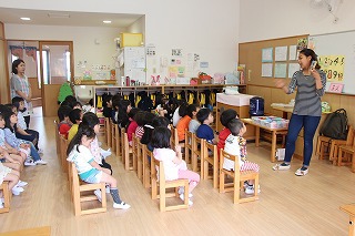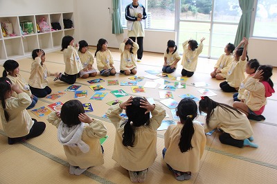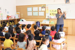 英語の先生が、毎日のように各クラスをまわって英語あそびをして下さっています。みんな先生が大好きで、英語に興味を持つ子どもたちも多く、英語教室も開いています(卒園児、在園児対象)。