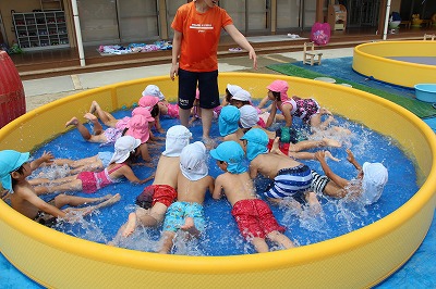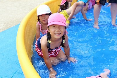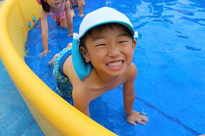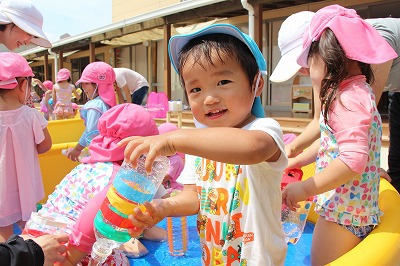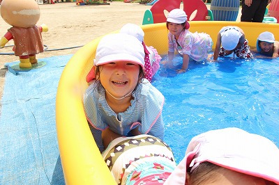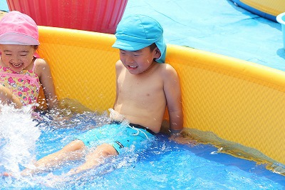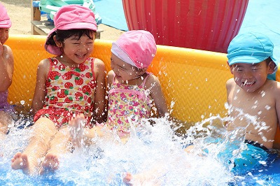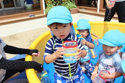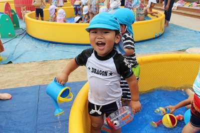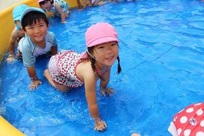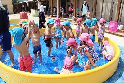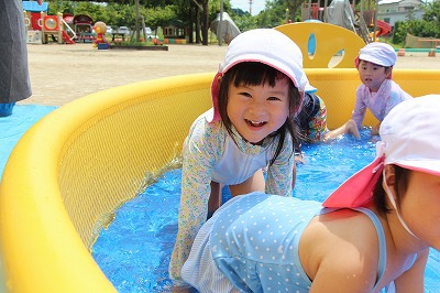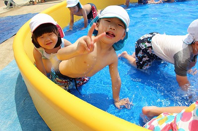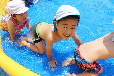 毎日暑い日が続いていますが、各クラスでプール遊びを楽しんでいます。日差しが強いときは、未満児クラスはテントを設置したり、熱中症対策を行いつつ、安全に楽しめるよう努めています。みんないい笑顔です♪