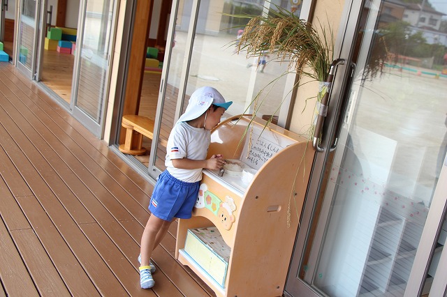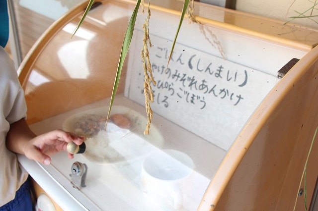 潮来市内では稲刈りが終盤にさしかかっていますが、こひつじ園の給食でもいよいよ新米がスタート(9/13)しました。毎日、みんな美味しい給食が楽しみです。給食が入っているサンプルボックスのところに来て、メニューを読みながら給食を楽しみにしているお友達もいます♪