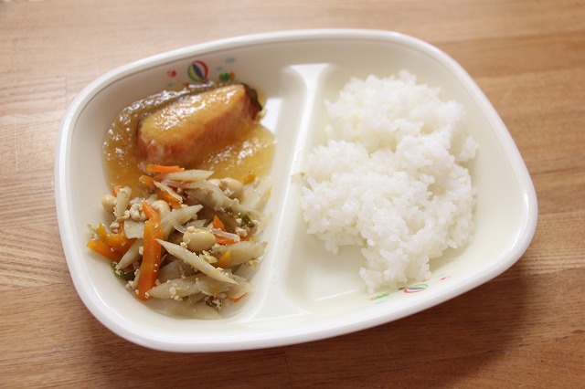 本日のメニューは、ご飯(新米)、鮭のみぞれあんかけ、きんぴらごぼう、味噌汁です。