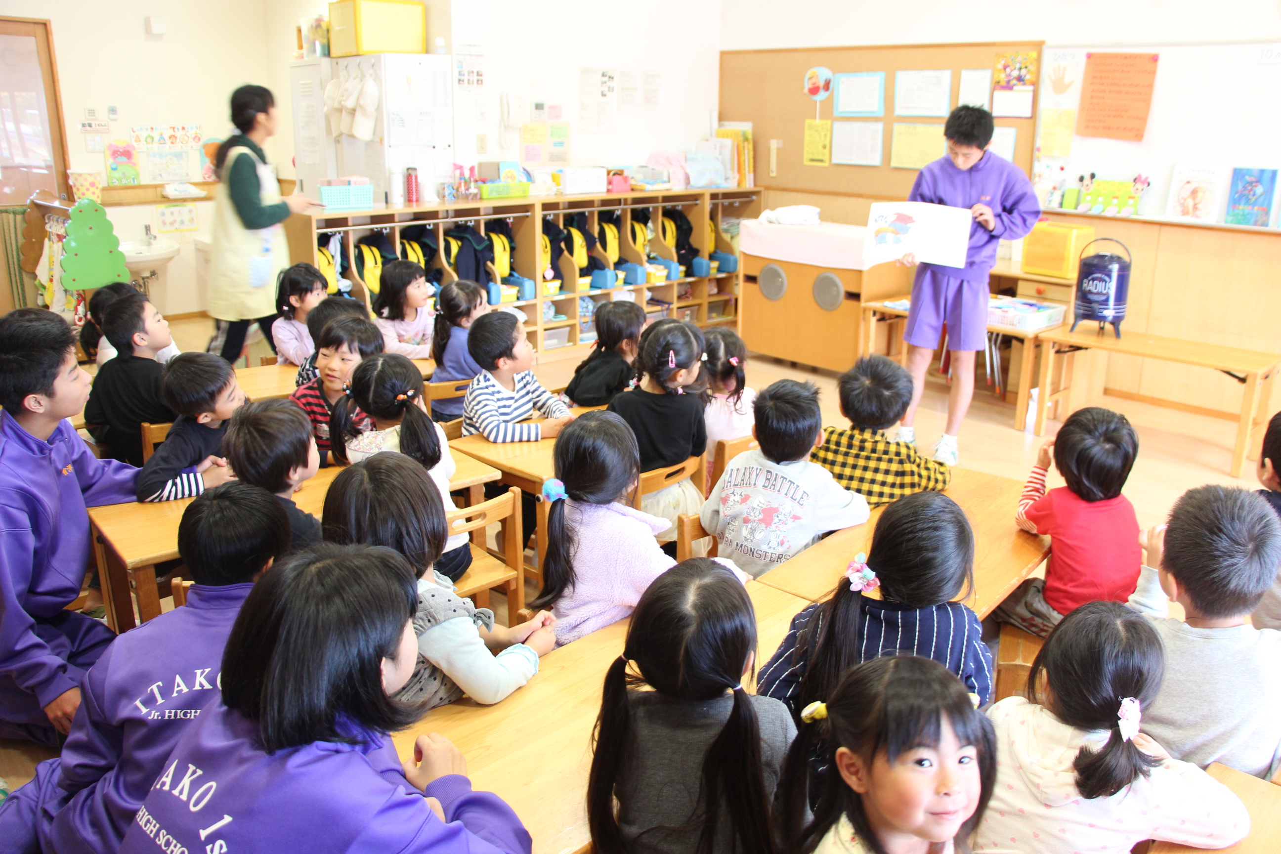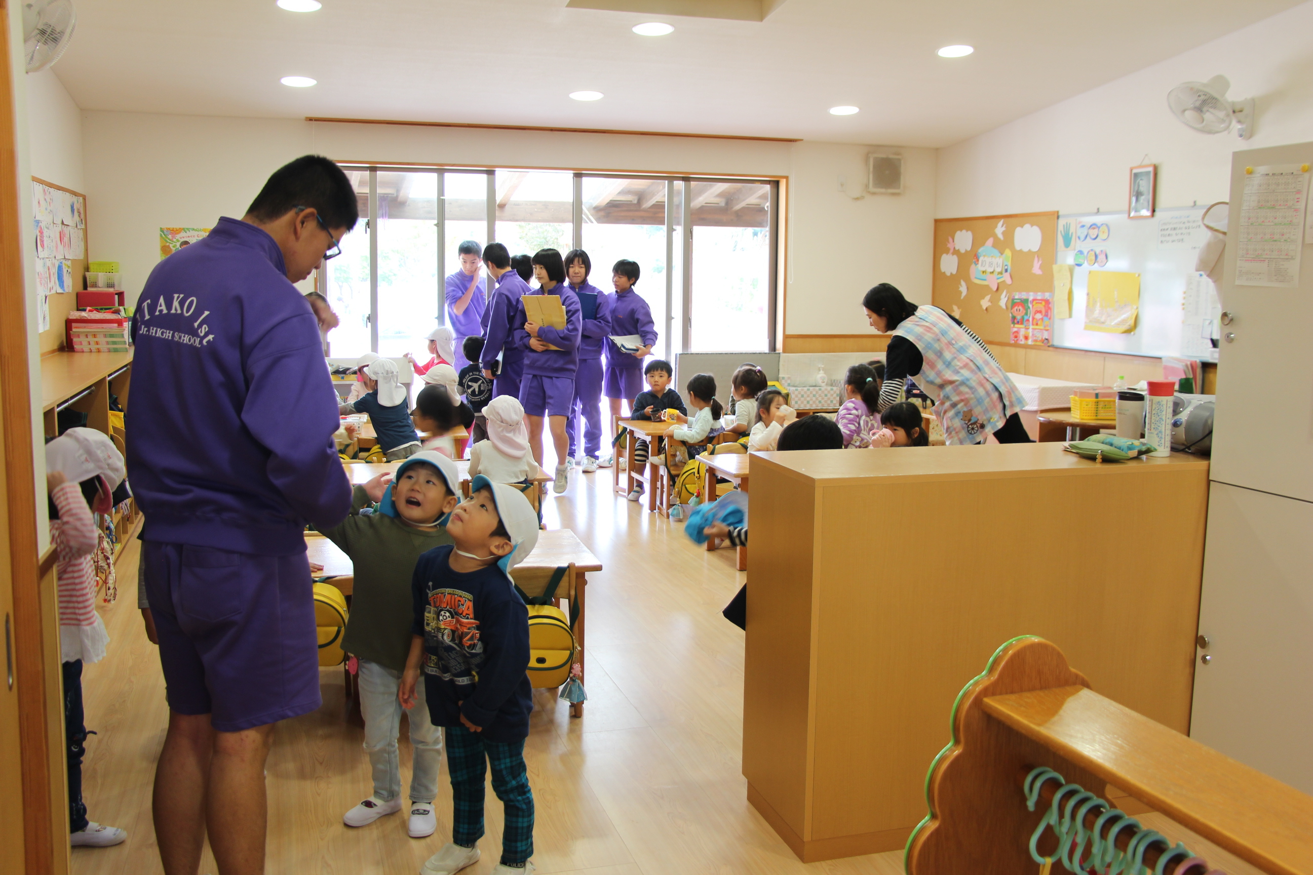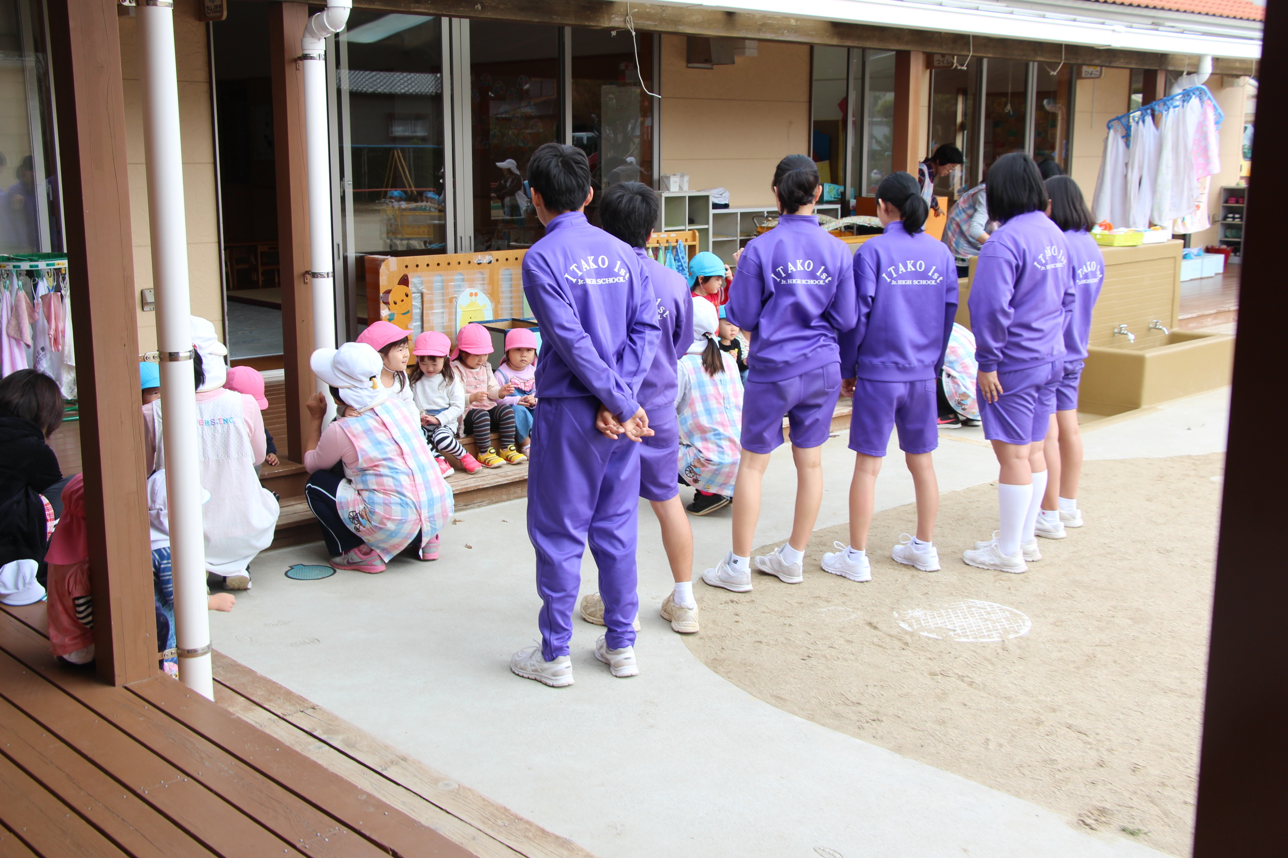潮来1中の3年生が、授業の一環で2日間に分けて来園し、各クラスの園児たちと一緒に過ごし遊んでくれました。本当に大きくなった卒園児が、在園児と一緒に遊んでくれる姿に大きな嬉しさを感じました。