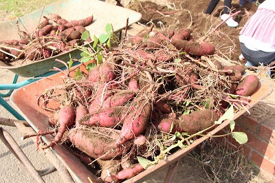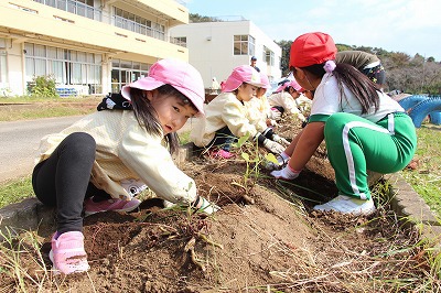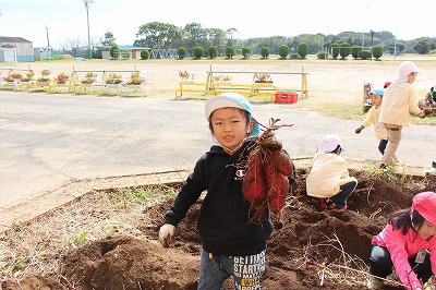 さくら組さんたちは、津知小1年生との交流に出かけました。サツマイモ苗を一緒に植えた畑で、今度は一緒に収穫です。サツマイモ掘りを行いました。大きいお芋を掘って大喜びでした。