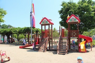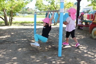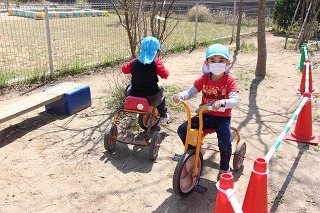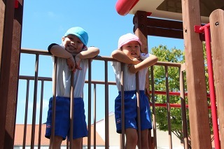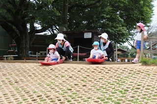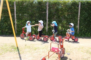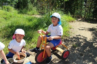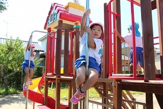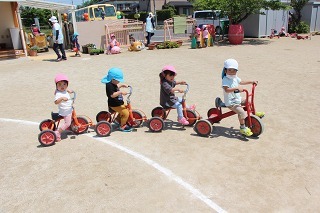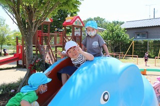 とっても良いお天気が続きましたね。園庭の新緑がとても綺麗です。園庭では子どもたちが思い思いの遊びを楽しんでいますよ。水分補給も上手に出来ています♪