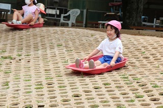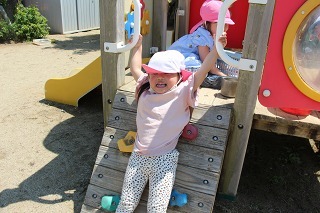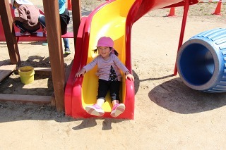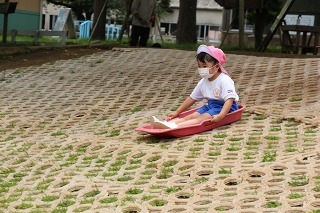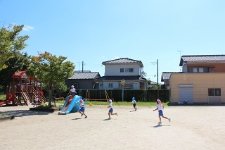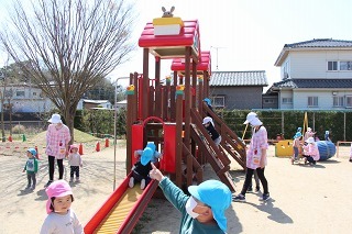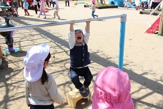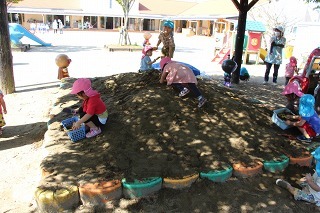 天気の良い園庭では、子どもたちが思い思いの遊びを元気いっぱい楽しんでいます。グラウンドでも、お砂場でも、遊具でも、つき山でも、楽しいことを見つけて笑顔いっぱい♪