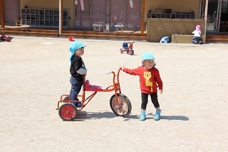 慣らし保育がスタートしています。新しい環境でいろんな経験と出会いをしています!笑って泣いて、たーくさんの刺激を受けながらの成長の一歩一歩です。とってもよいお天気の園庭で、のびのび遊んでいます♪