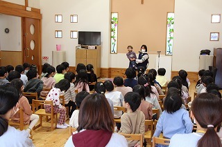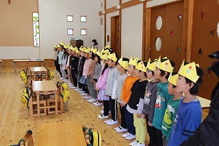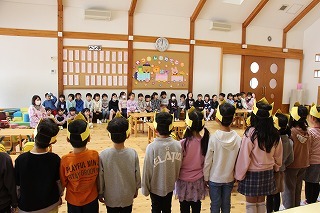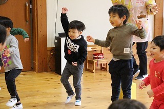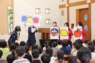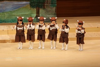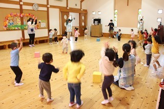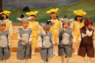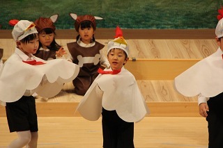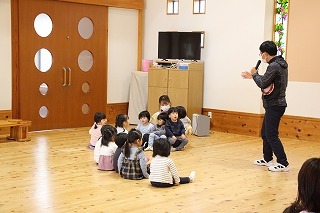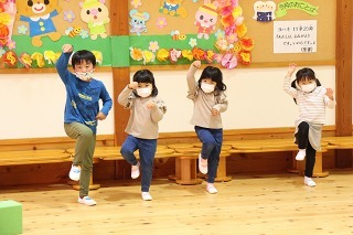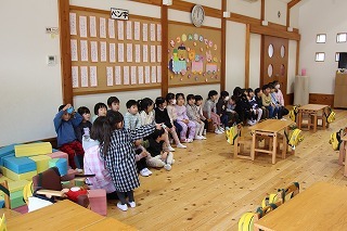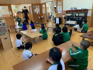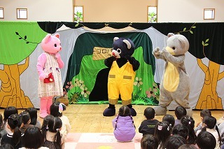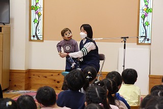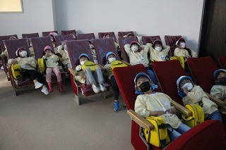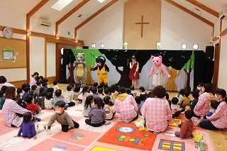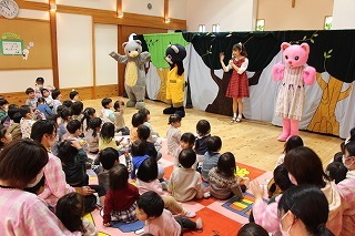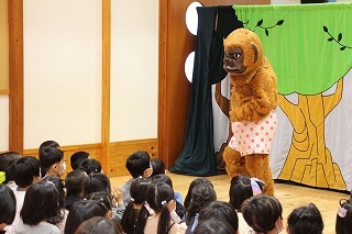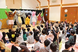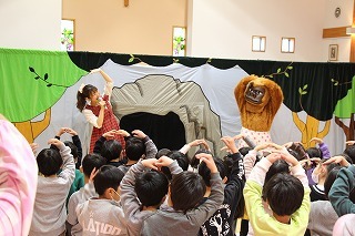 大きいクラス、小さいクラスに分かれて2部制で行いました。コロナ禍となり観劇の時を持つことが出来ませんでしたが、ようやく催しを再開することが出来て、みんな喜んでいました。楽しい劇を観劇しながら、リズムに乗ったり体を動かして過ごしました★