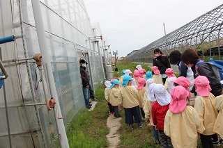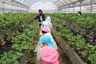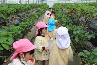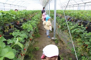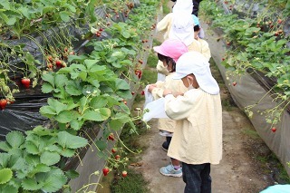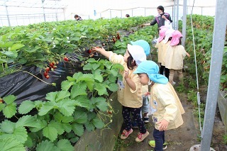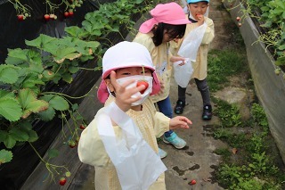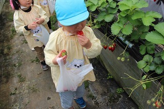 ゆり組、さくら組は、それぞれの日に、アンパンマンバスに乗って、イチゴ狩りに行きました。食べきれないほどのイチゴが実っているハウスで、大好きなイチゴを沢山いただくことが出来ました。ありがとうございました!