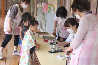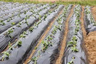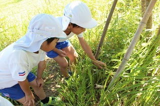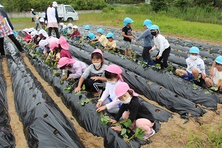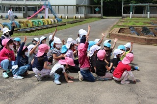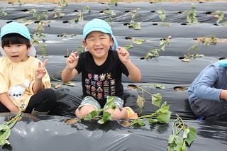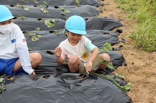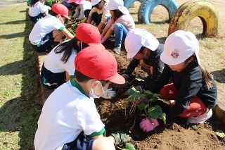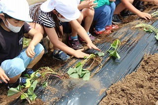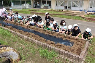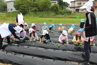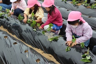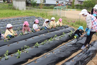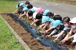 さくら組、ゆり組の園児たちと一緒に、さつまいも苗植えを行いました。秋は、ばら組さんも一緒にさつまいも掘りの予定です。おーきくなーれ♪