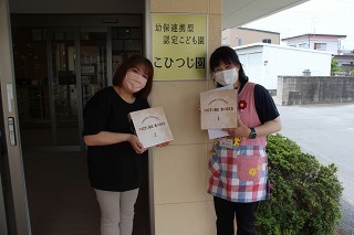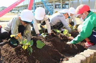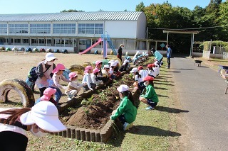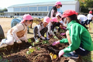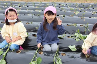 さくら組さんは、津知小学校へ行き、1年生と一緒にサツマイモ苗植え体験をしてきました。1年生は、畑の準備、サツマイモに関するクイズも用意して待っていてくれました。卒園生の成長した姿も見ることができて感謝でした★