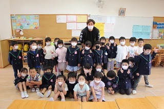 野澤大志ブランドン選手(GK : FC東京所属、現在はJ2いわてグルージャ盛岡に期限付き移籍中)が来園して、さくら組の園児たちと会うことが出来ました。193㎝の高身長に、みんなビックリ。記念写真も♪野澤選手はクリスチャンで、キリスト教認定こども園のこひつじ園に遊びに来てくれました!