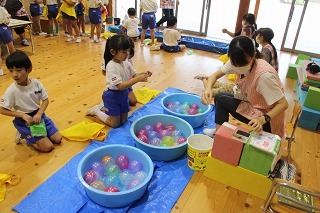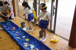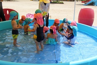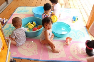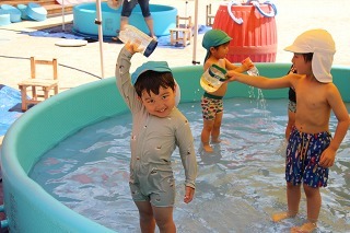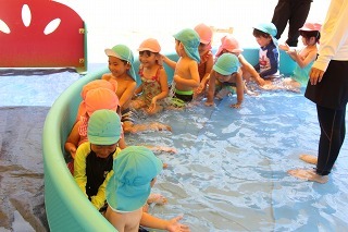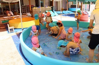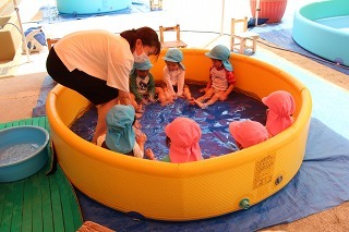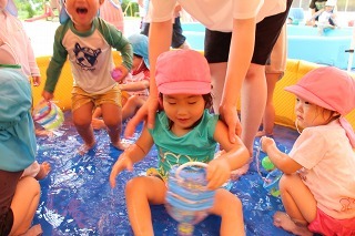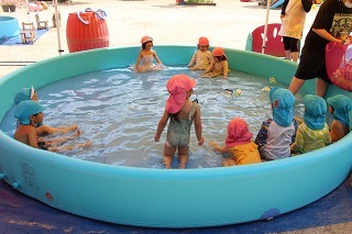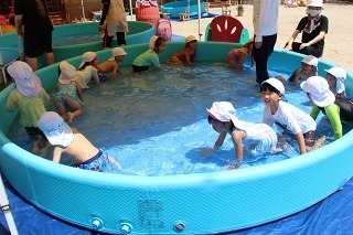 各クラスで、水遊び、プール遊びがスタートしました。みんな楽しみにしていたひと時です★水も浅めに、監視をつけて、安全に遊べるように配慮しながら行っています。