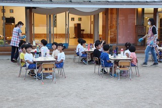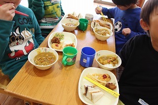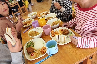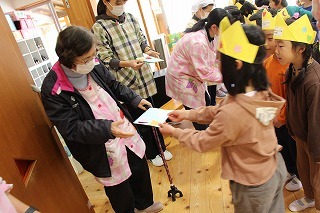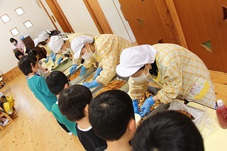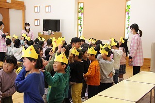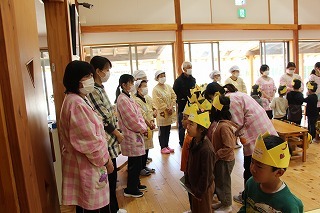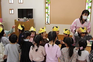 お別れ会とバイキング給食(バイキング形式は年長児のみ)が持たれました。ゆり組さんが作成したプレゼントを一人一人に渡して、ありがとうの言葉を贈りました。さくら組さんもお歌を歌って気持ちを伝えてくれました。また、年長児さんは、ホールでバイキング給食。たくさんのメニューをおいしくいただきました★