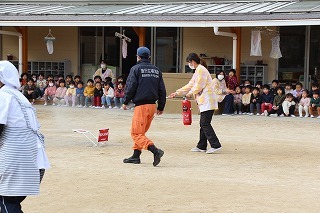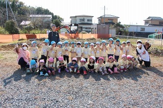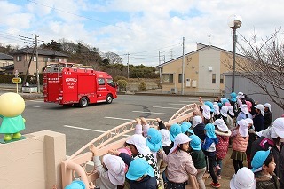 今月の避難訓練では、消防士さんが消防車に乗って来園してくださいました。なんと、避難訓練後にお話しくださった消防士さんは卒園児。私たちにとってもうれしい出来事でした。みんなで職員の消化訓練を見届けて、クラスごとへ消防車のところへ行き、記念撮影。最後まで見送っていましたよ★