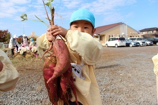さくら・ゆり・ばら組は、園の畑に行って、サツマイモを収穫しましたよ。とっても大きな立派なお芋が出来ました。一生懸命に掘っている子どもたち、あちらこちらで嬉しい声が聞こえてきます。こんなに大きなお芋がとれたよ!