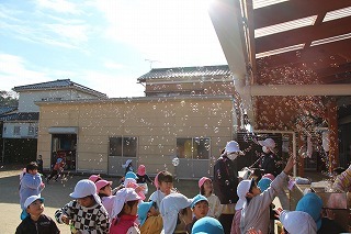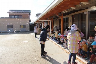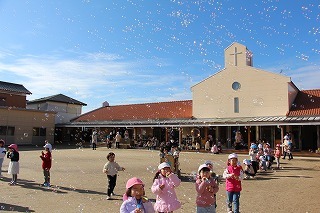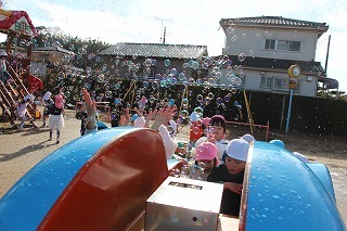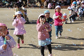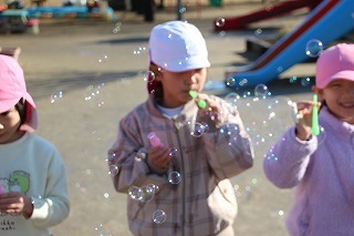 とっても良いお天気の中、全クラスでシャボン玉大会を行いました。みんなでたくさんのシャボン玉を作って、楽しいひと時を過ごしました。シャボン玉マシーンから飛び出る無数のシャボン玉も、みんなで追いかけていました♪