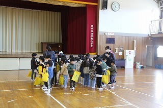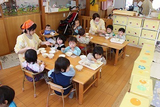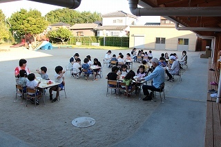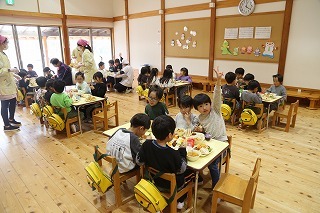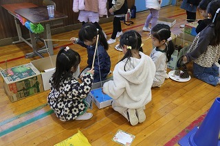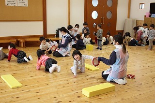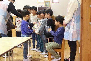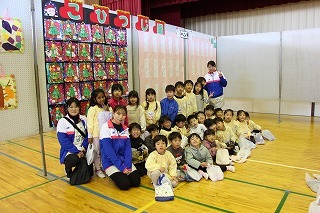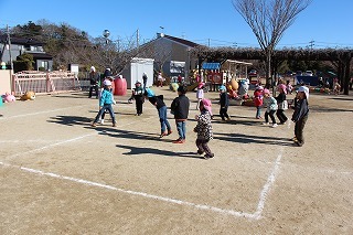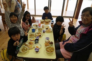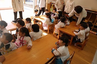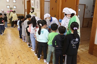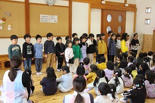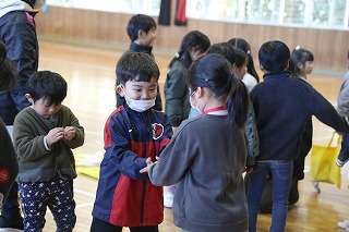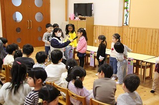 お別れ会がもたれました。年中児&年長児さんたちは一緒にグラウンドで遊び、その後、遊戯室でプレゼントを渡したり、歌を歌ったりのひと時を過ごしました。その後、年長児さんたちは遊戯室でバイキング給食を頂きました♪沢山おかわりをして、本当に美味しかったね!