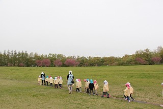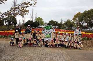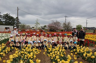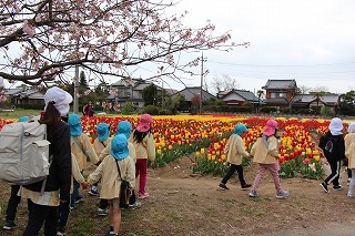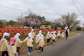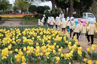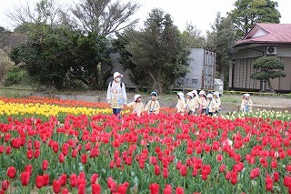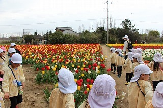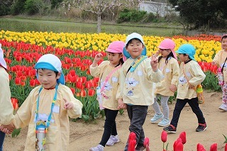 年長児さんたちは、園バスに乗って和田公園に。曇り空でしたが、色とりどりの沢山のチューリップが咲いていました。とっても綺麗な光景に、みんなビックリ。お散歩しながら、チューリップ見学を楽しむことが出来ました!