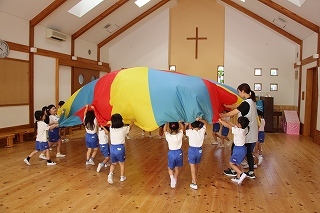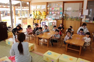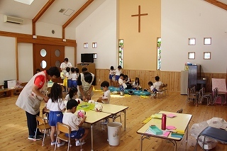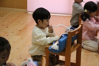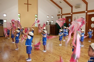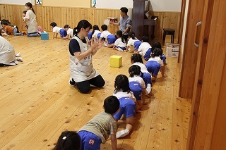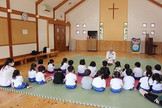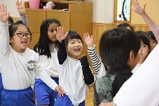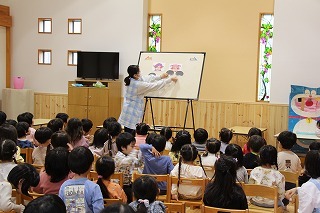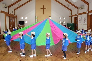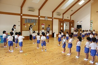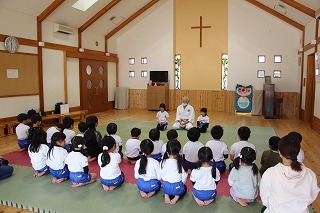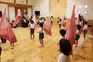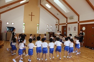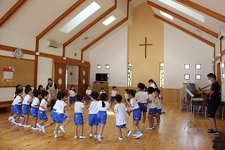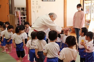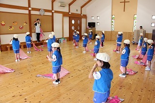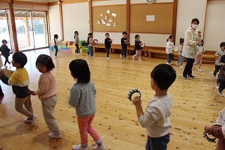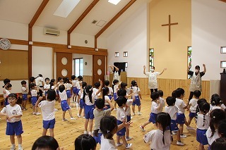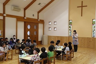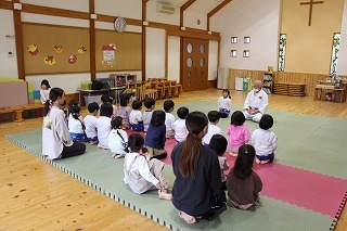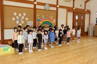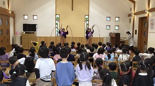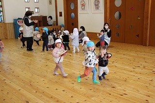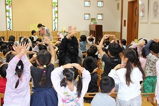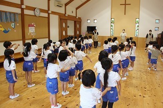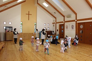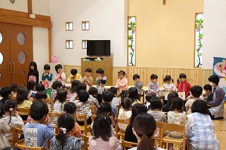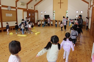 月曜は、4月のお誕生会。クラスごとに担任より手作りのプレゼント♪祝福のお祈りをして頂き、お楽しみのひと時。火曜日は、マーチング講習。以上児クラスのみんなが遊戯室に集まって、講師のリズムと指導を聞きながら、楽しく元気に歌ったり体を動かしました!