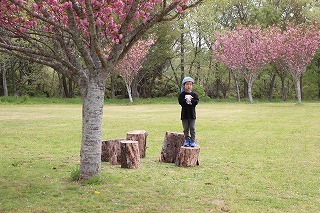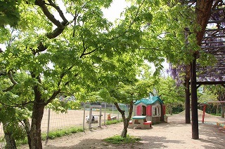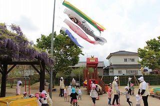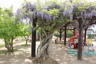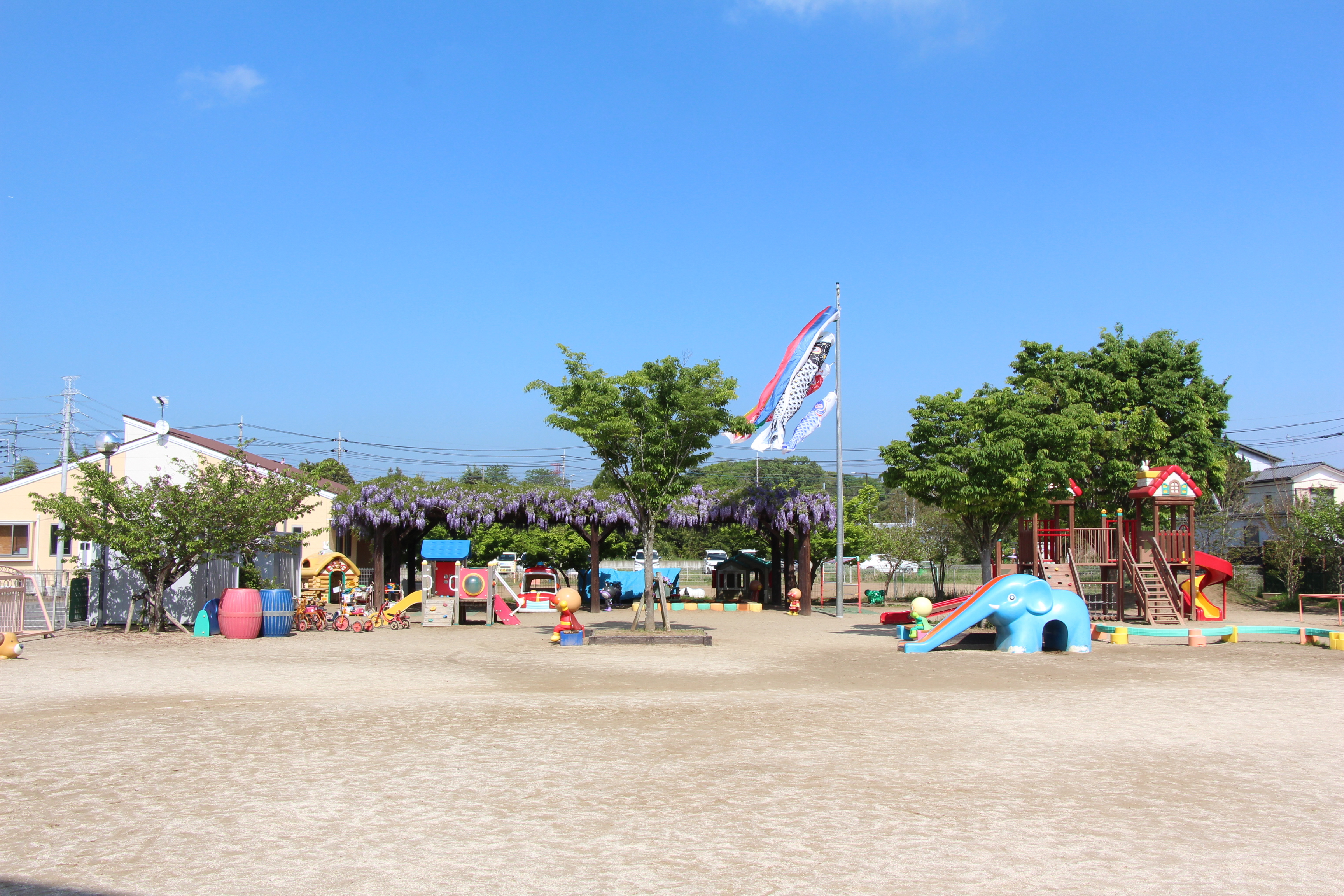 八重桜、藤の花、新緑と、色とりどりの園庭の風景。あたたかい日が続く中で、園庭でのびのびと遊んでいます♪